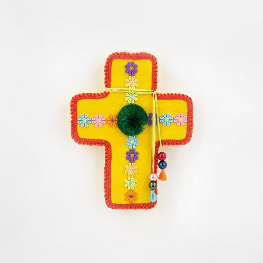 Cruz Decorativa Amarilla con Orilla Naranja y Flores