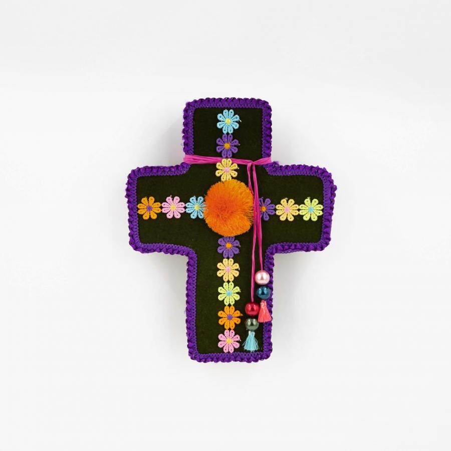 Aporta un toque de fe y tradición a tu hogar con esta cruz decorativa verde. Su orilla morada y flores te harán sentir la paz y la espiritualidad. Medidas: 24x7x31 cm.