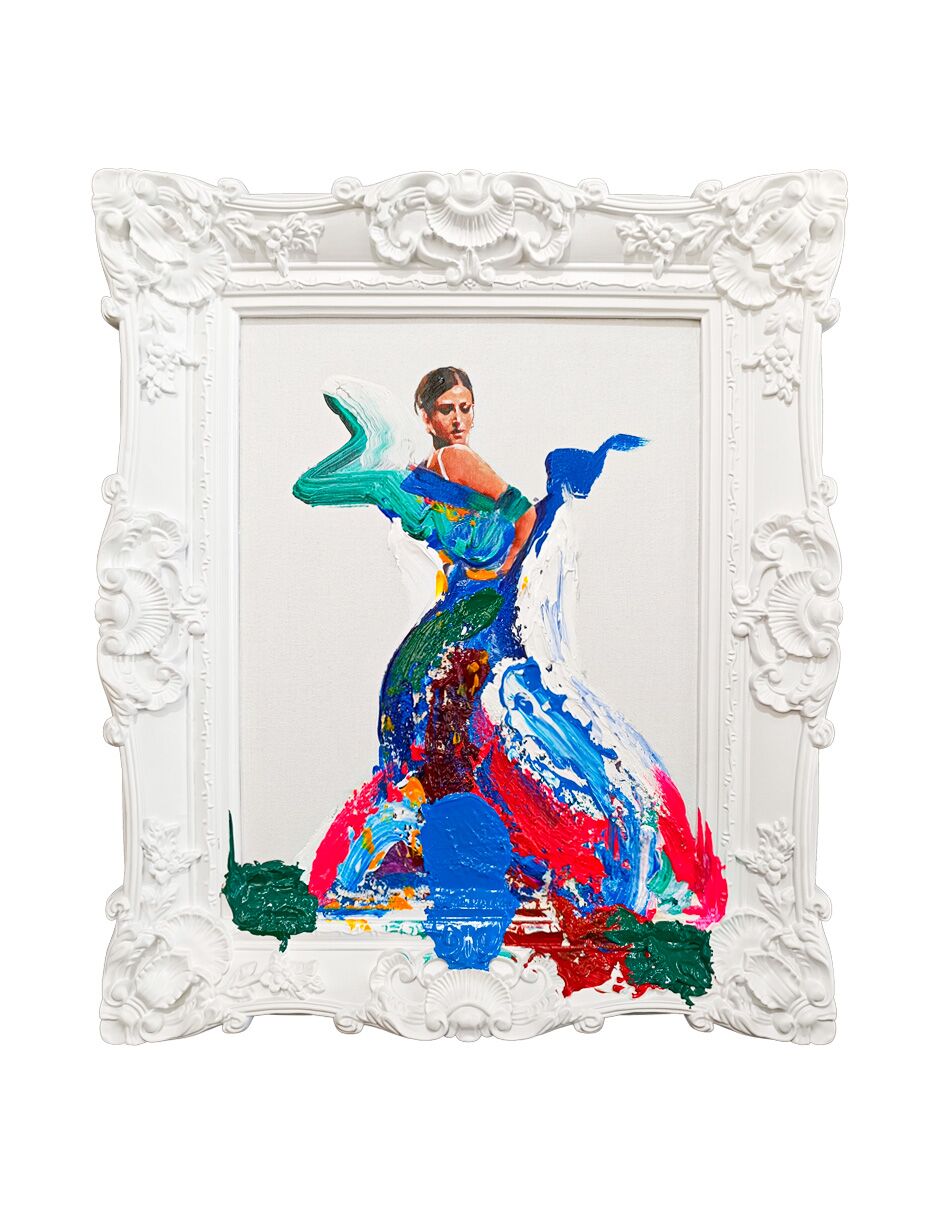 Cuadro con marco blanco diseño bailarina con vestido de colores azul y rojos de 60x70cm