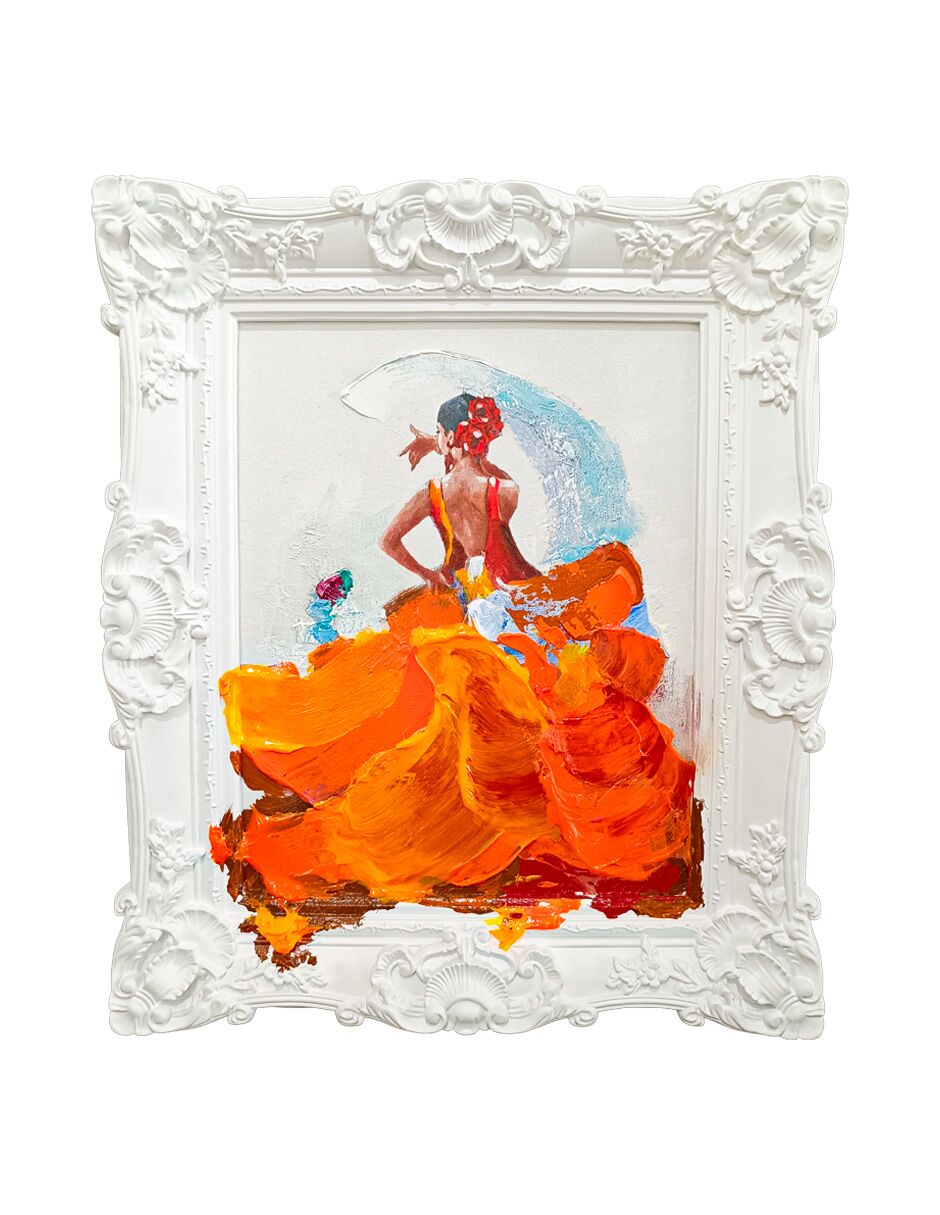 Cuadro con marco blanco diseño bailarina con vestido naranja de 60x70cm