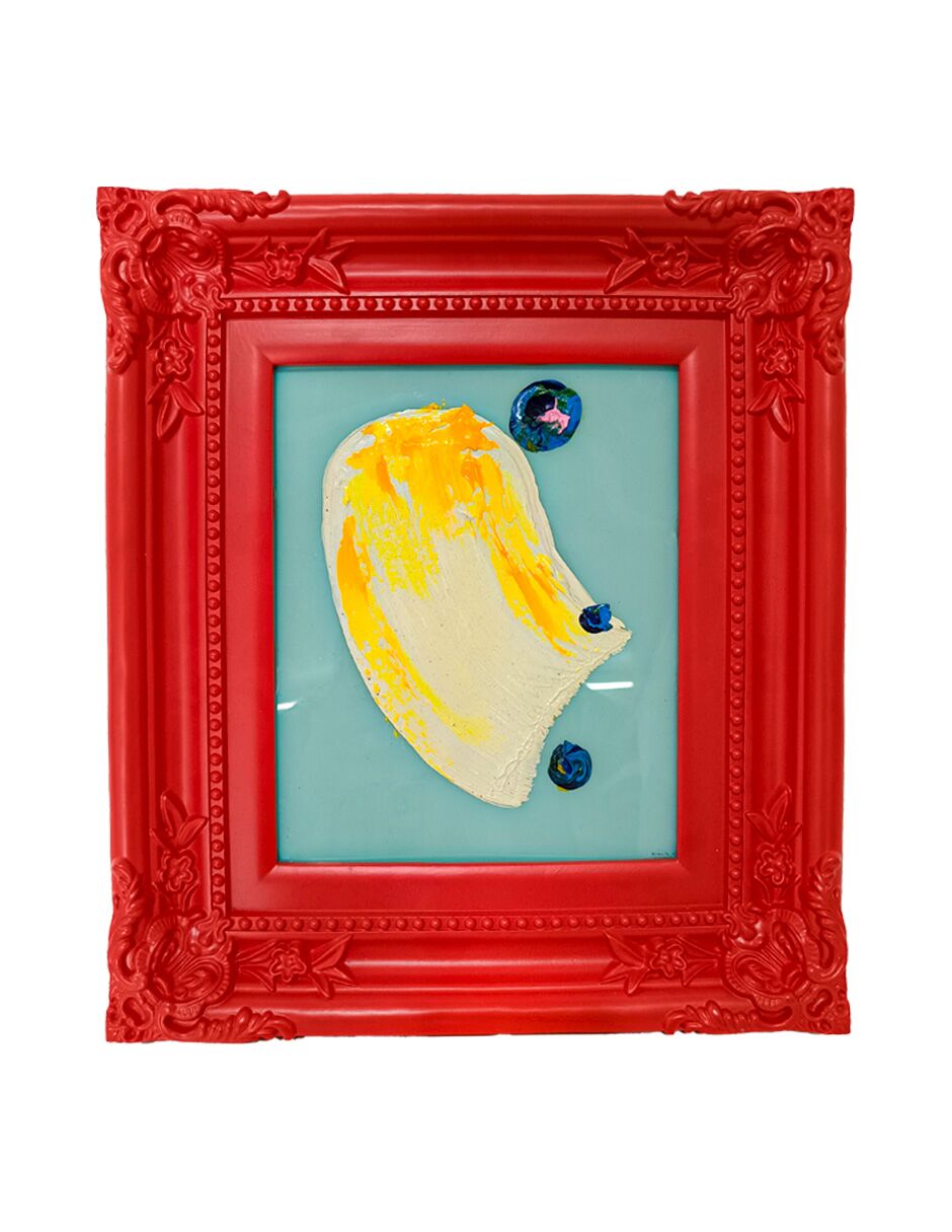 Cuadro con pintura de color amarillo y colores con marco rojo de 30x36cm