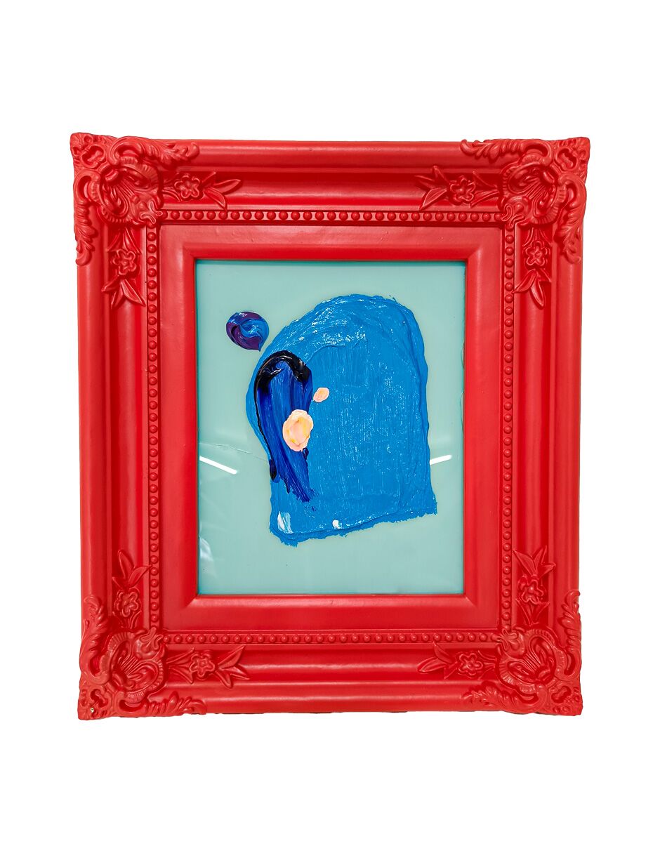 Cuadro con pintura de color azul y colores con marco rojo de 30x36cm