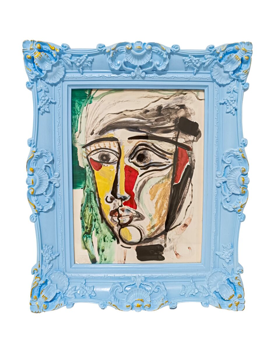Cuadro con rostro con colores negros y rojos y marco azul claro de 45x55cm