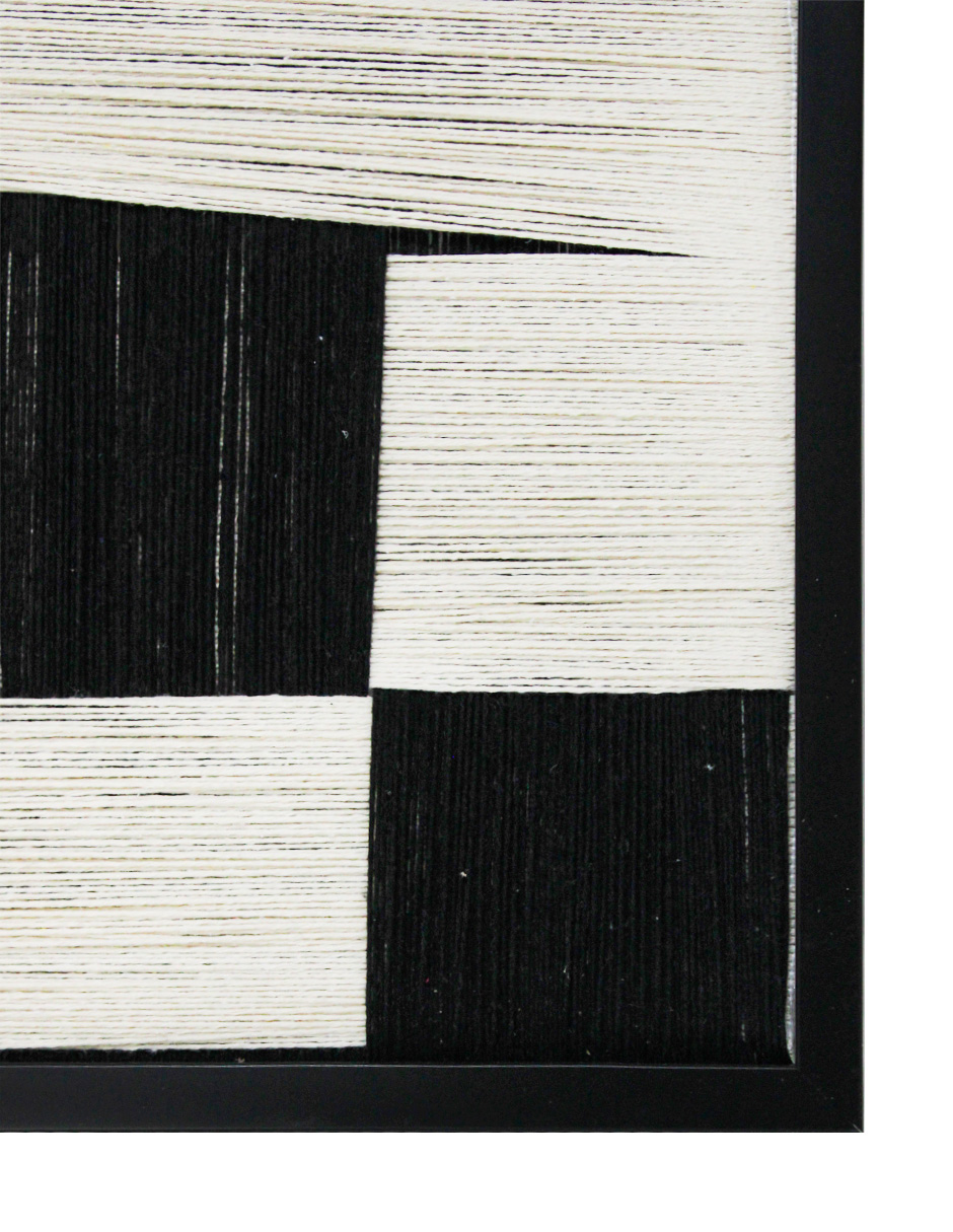 Cuadro decorativo con un original diseño de hilo con cuadros negros. Esta pieza es ideal para quienes buscan una decoración moderna y elegante. Su diseño único evoca una sensación de estilo y sofisticación, perfecta para crear un ambiente único y lleno de encanto. Material: hilo, madera. Medidas: 50x70x2.8cm.
