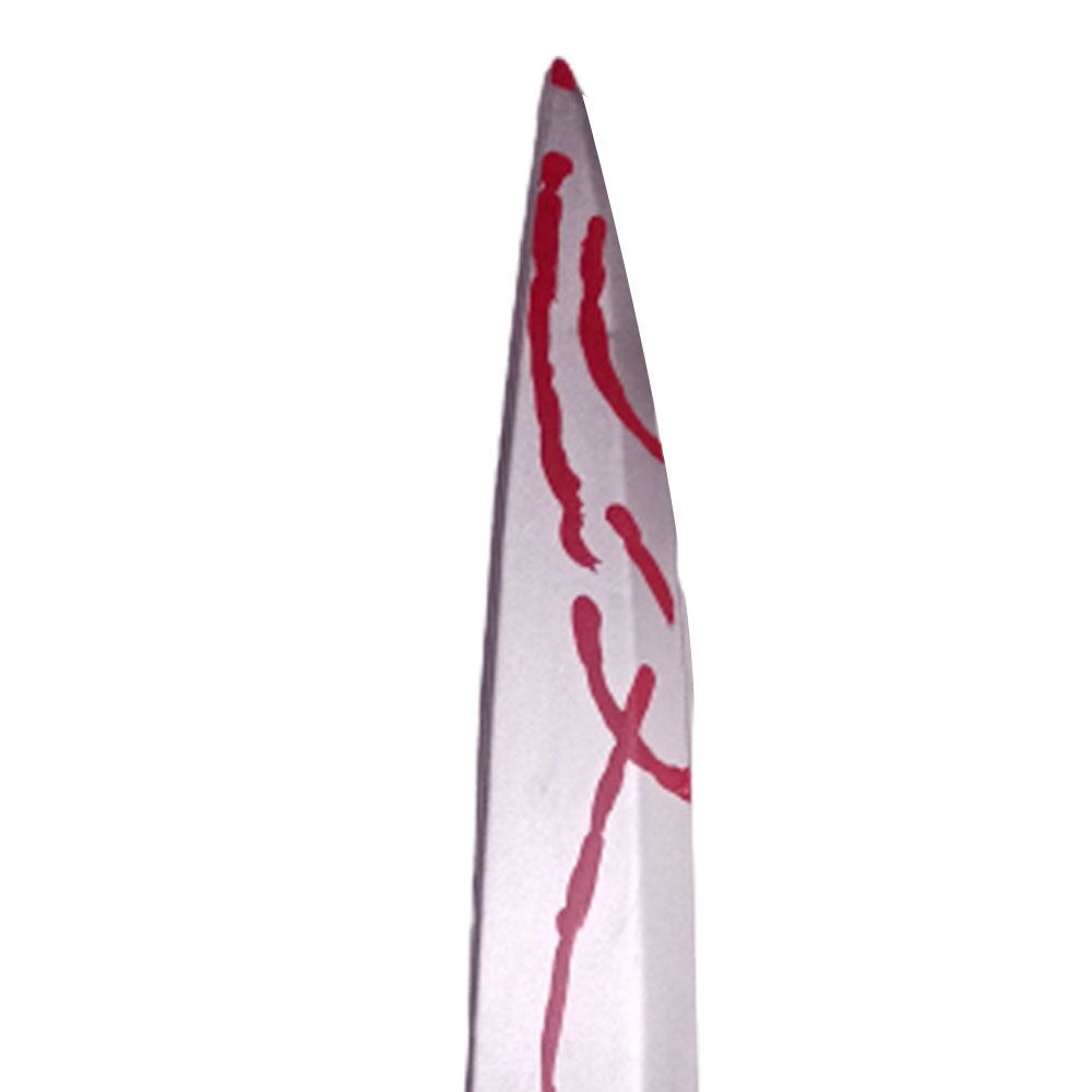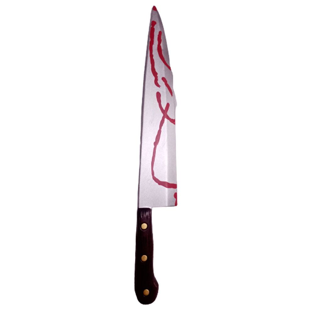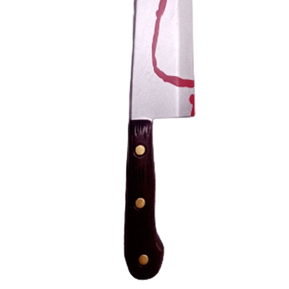 Impactante cuchillo de disfraz para un toque de terror en tu atuendo. Fabricado en látex, es seguro y flexible, ideal para completar disfraces de Halloween. Su diseño simula la apariencia de un cuchillo de chef con salpicaduras rojas, perfecto para añadir un elemento espeluznante a cualquier personaje.
