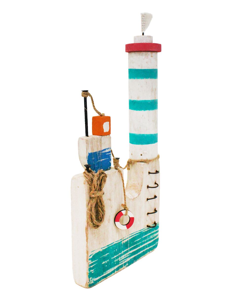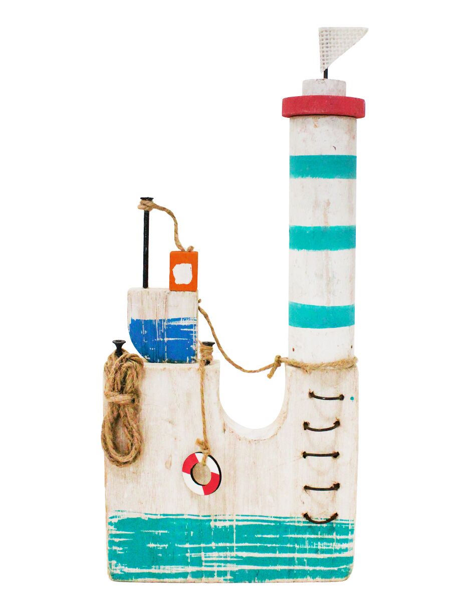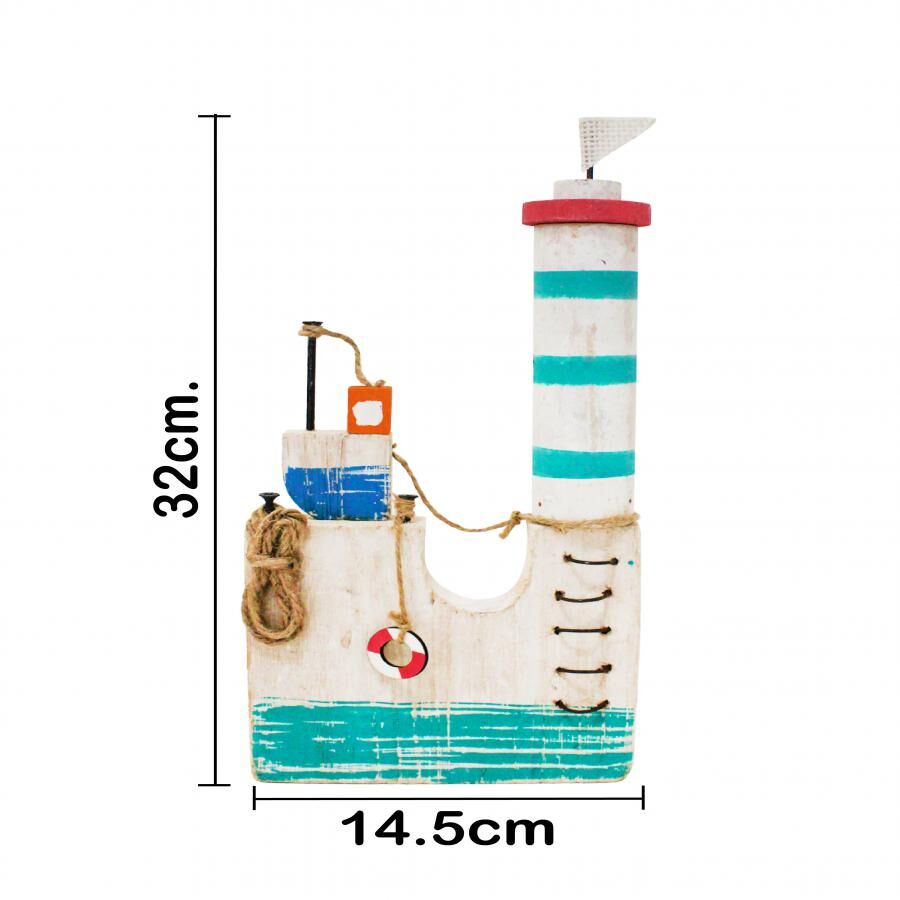 Decoración con un original diseño de faro. Esta pieza es ideal para quienes buscan una decoración marinera y rústica. Su diseño único evoca una sensación de frescura y tranquilidad, perfecta para crear un ambiente único y lleno de encanto. Material: madera.