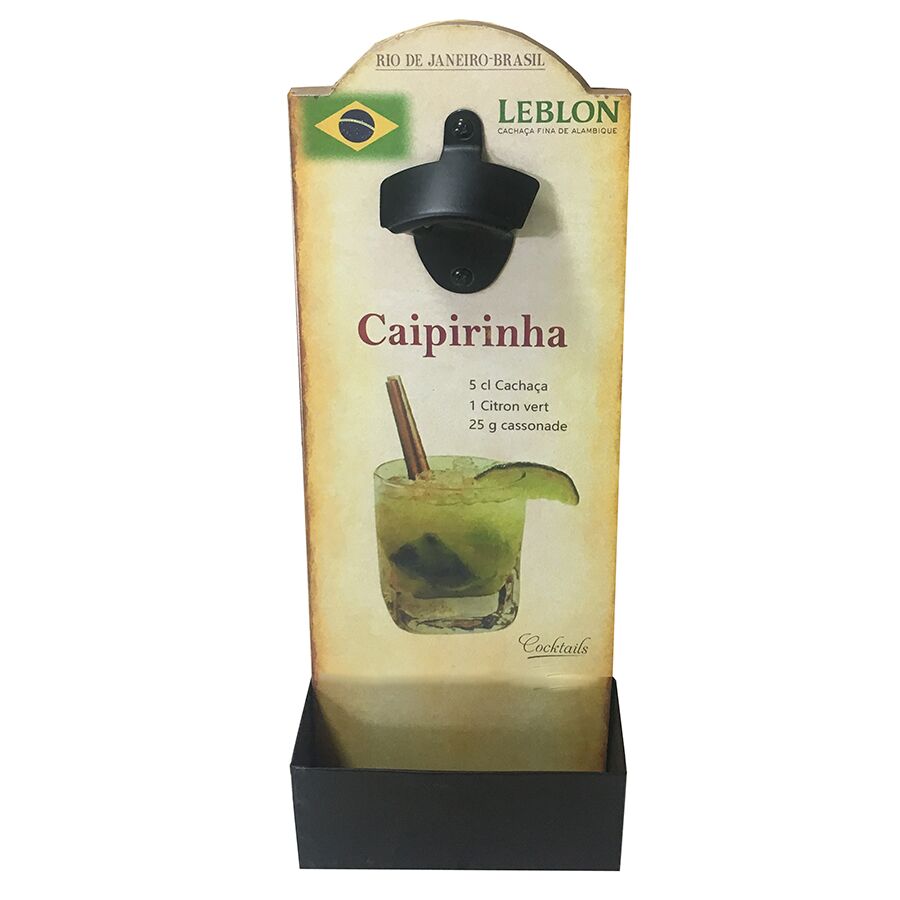 Destapador de pared con un diseño temático inspirado en el coctel Caipirinha. Fabricado con una base de madera maciza y una pieza de metal resistente para destapar. Un toque exótico y funcional para la zona de bebidas. El material es madera y metal. Medidas: 14 x 6 x 37 cm.
