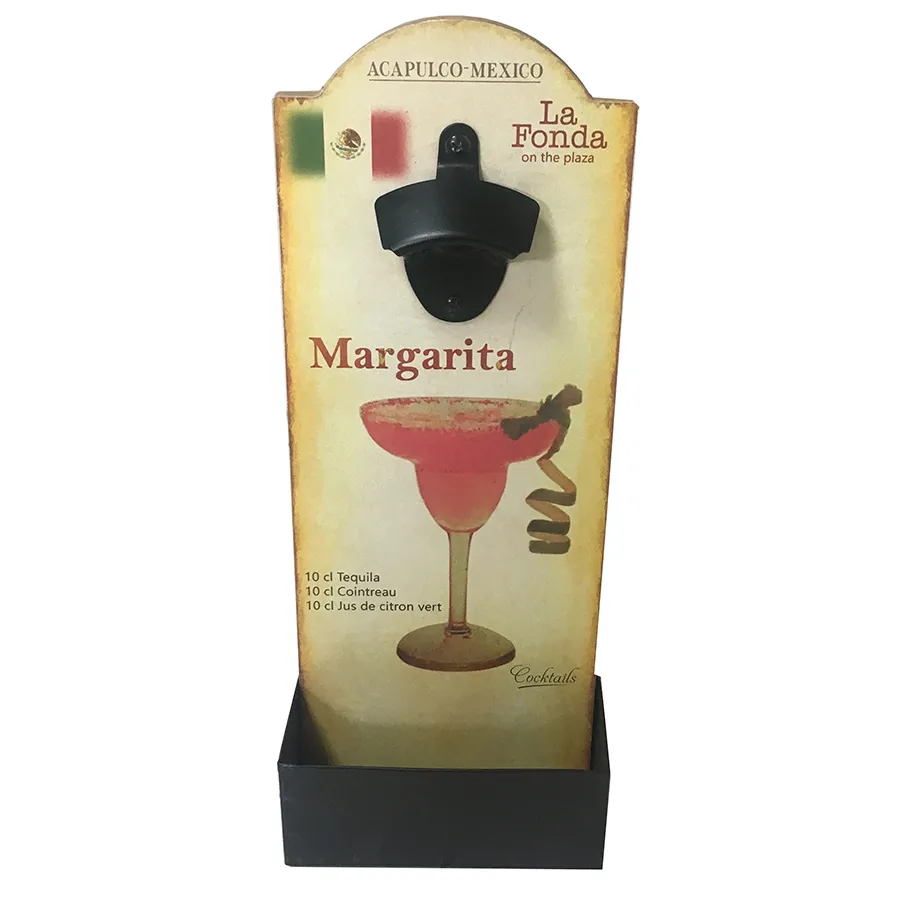Destapador de pared con un diseño temático inspirado en el coctel Margarita. Fabricado con una base de madera maciza y una pieza de metal resistente para destapar. Es un accesorio práctico y una pieza de arte en la pared. El material es madera y metal. Medidas: 14 x 6 x 37 cm.