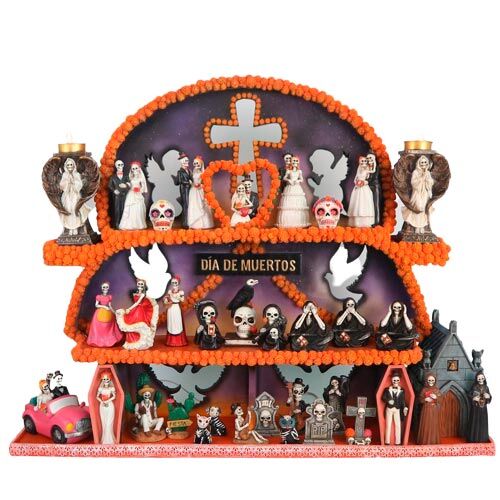 Un toque de tradición y magia para tu hogar. Este altar de “Día de Muertos” de poliresina es la pieza perfecta para honrar a tus seres queridos y añadir un aire festivo a tu espacio. Con sus detalladas figuras, iluminación integrada y un tamaño de 78.74×18.29×62.23cm, su diseño elaborado crea un ambiente lleno de vida y color, ideal para una mesa principal o cualquier rincón especial.