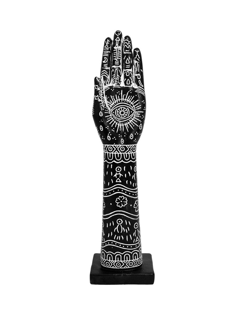 Escultura Palma Ojo de Horus. Esta pieza es mucho más que un simple objeto decorativo; es un centro de espiritualidad y equilibrio diseñado para llevar la energía de la protección milenaria directamente a tu hogar. El diseño destaca por su estructura esbelta en color negro profundo, que organiza de forma impecable una serie de grabados en blanco que incluyen el Ojo de Horus en el centro de la palma, rodeado de patrones geométricos y símbolos de la naturaleza. Esto proyecta una sensación de paz y resguardo constante en cualquier oficina, rincón de meditación o sala de estar. Además, la figura fomenta la seguridad y la armonía al representar el amuleto egipcio de la salud y la visión espiritual. Estos elementos crean un entorno de bienestar y serenidad total. Por ello, integrar este elemento transforma una estancia común en un escenario de lujo visual holístico. Su impacto estético define un estándar de exclusividad único.