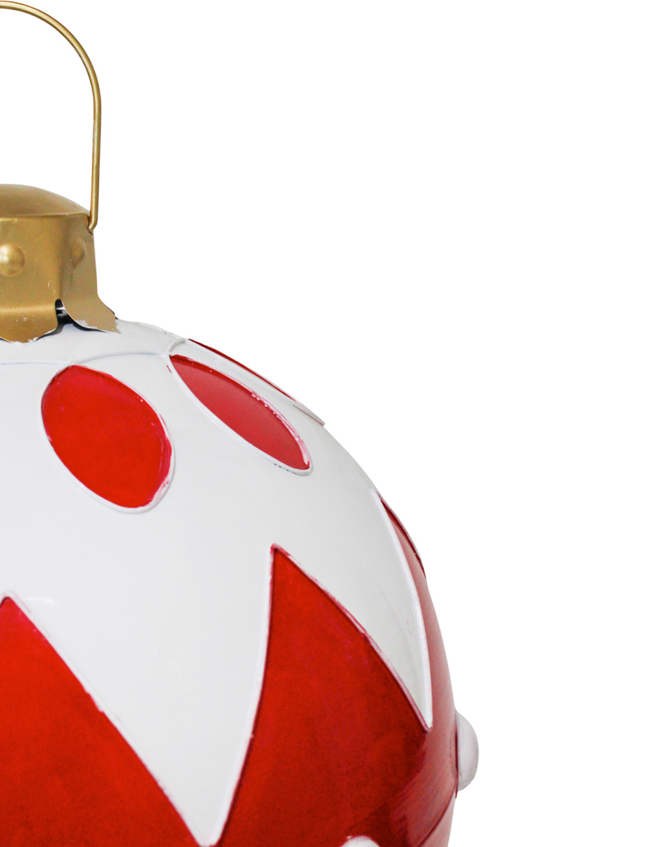 Esfera de decoración en un elegante color blanco, con rombos y detalles en rojo. Esta pieza es ideal para quienes buscan una decoración clásica y atemporal. Su diseño evoca una sensación de tradición y sofisticación, perfecta para crear un ambiente elegante y festivo que llenará tu hogar de un encanto inolvidable. Material: metal. Medidas: 50x50x53.5cm.