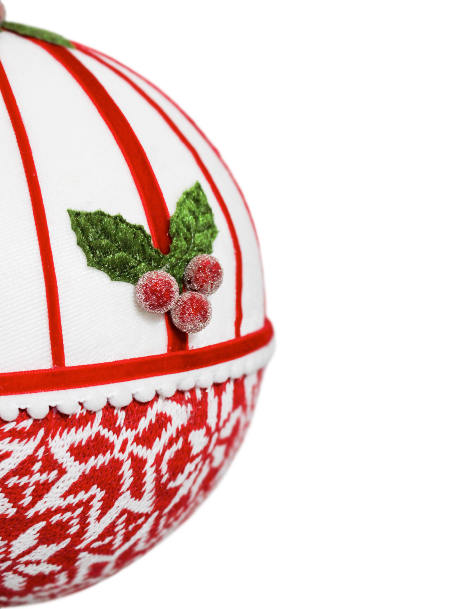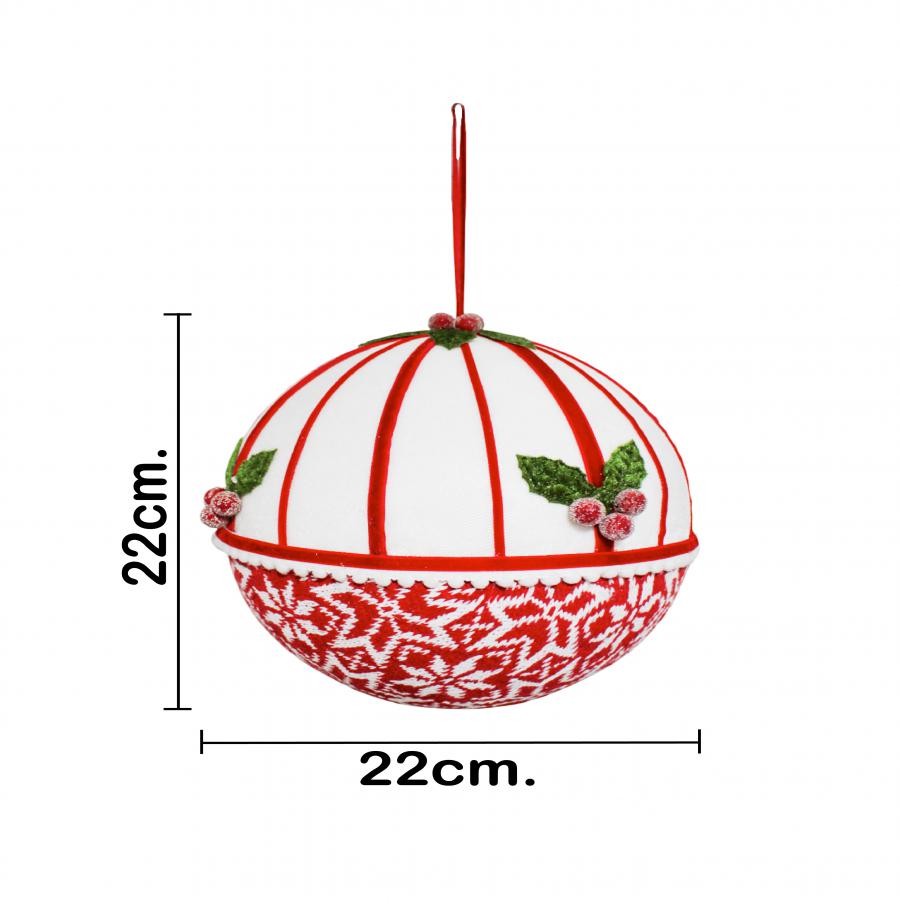 Siente la magia de la Navidad con esta festiva esfera de gajos blancos. Su base roja nevada y muérdagos te hará sentir la alegría y la tradición. Medidas: 23x23x22 cm.