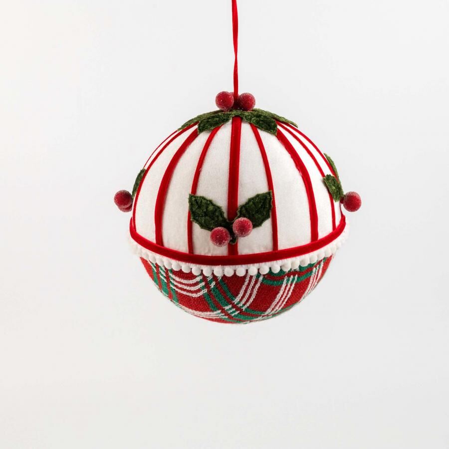 Siente la magia de la Navidad con esta festiva esfera de gajos blancos. Su base roja con verde y muérdagos te hará sentir la alegría y la tradición. Medidas: 18x18x17 cm.