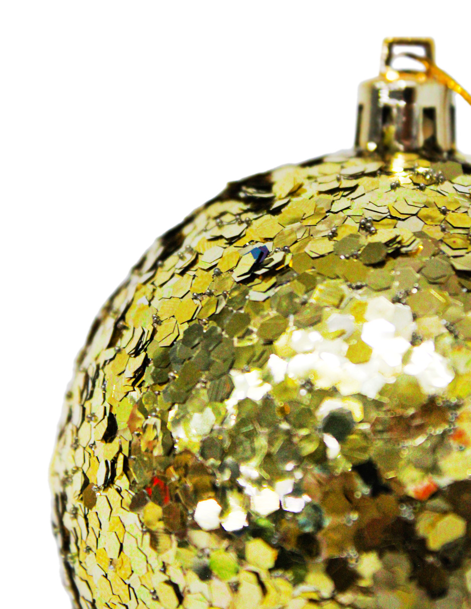 Esfera de plástico forrada completamente con lentejuela dorada. Su textura y brillo son ideales para un estilo lujoso y festivo.