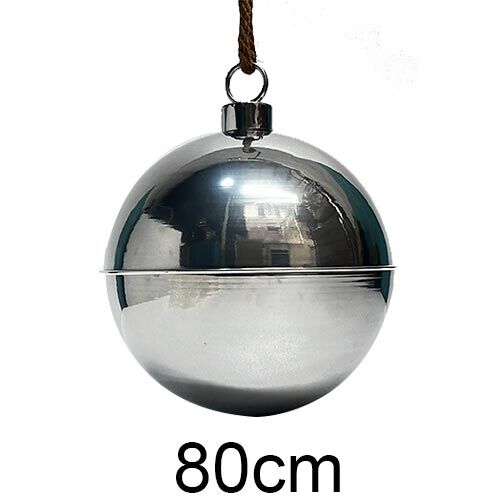 Inyecta el máximo estilo contemporáneo y un brillo glacial a tu decoración con este imponente cascabel metálico. Su diseño en un sofisticado acabado cromado (simulando plata brillante) se complementa con una robusta cuerda, creando un acento visual moderno, elegante y de máxima distinción. El suave tintineo del cascabel es el acento perfecto para infundir alegría, un toque chic y el sonido auténtico de la temporada en tu árbol o entrada. Material: Metal Cromado. Medidas: 80 cm de altura (medida principal).