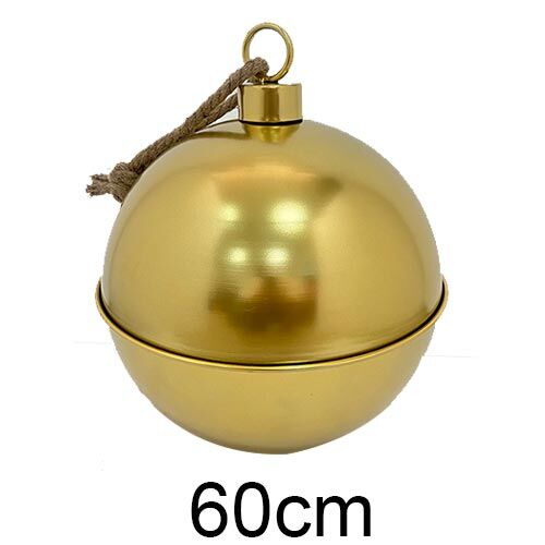 Elegante esfera decorativa de metal con un acabado dorado brilloso y una cuerda para colgar. Medidas: 50 cm. Su enorme tamaño, color clásico y brillo intenso son perfectos para añadir un toque de lujo y gran distinción a tu decoración.
