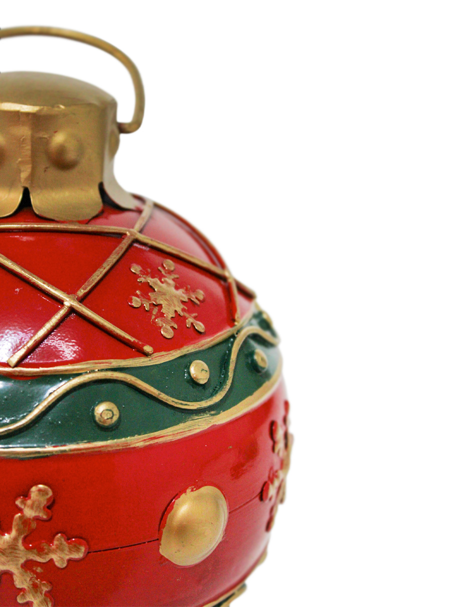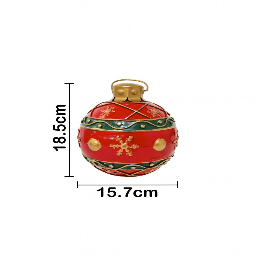 Esfera de decoración en un festivo color rojo con toques en verde y elegantes copos de nieve dorados. Esta pieza es ideal para quienes buscan una decoración clásica y atemporal. Su diseño evoca una sensación de tradición y sofisticación, perfecta para crear un ambiente elegante y festivo que llenará tu hogar de un encanto inolvidable. Material: metal. Medidas: 16x16x19cm.