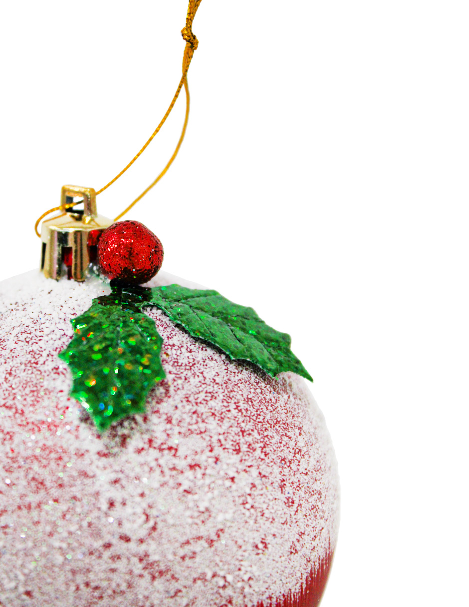Esfera decorativa en color rojo con diseño nevado y muérdago. Ideal para un estilo invernal, festivo y romántico.