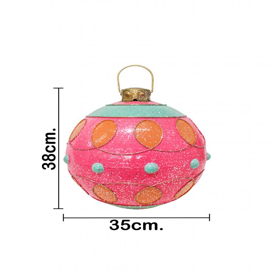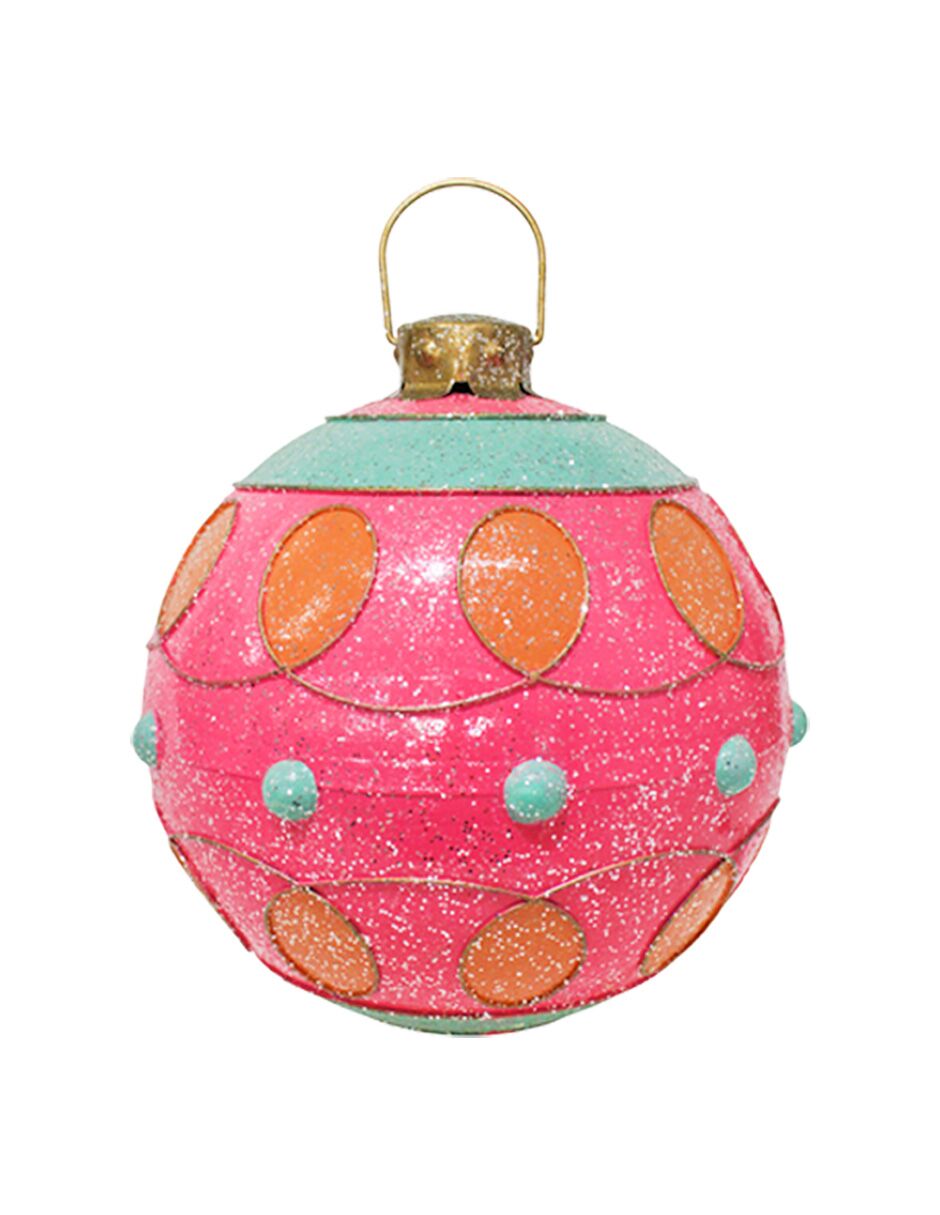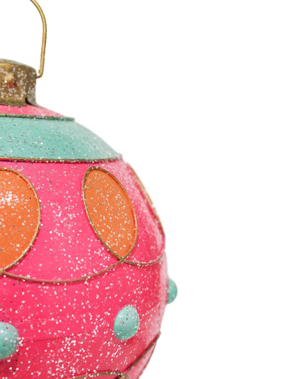 Esfera de decoración en un delicado color rosa, adornada con patrones en amarillo y aqua. Esta pieza es perfecta para quienes buscan una decoración moderna y original que se aleje de lo tradicional. Su vibrante combinación de colores evoca una sensación de alegría y frescura, ideal para crear un ambiente lúdico y festivo. Material: metal. Medidas: 35x35x38cm.