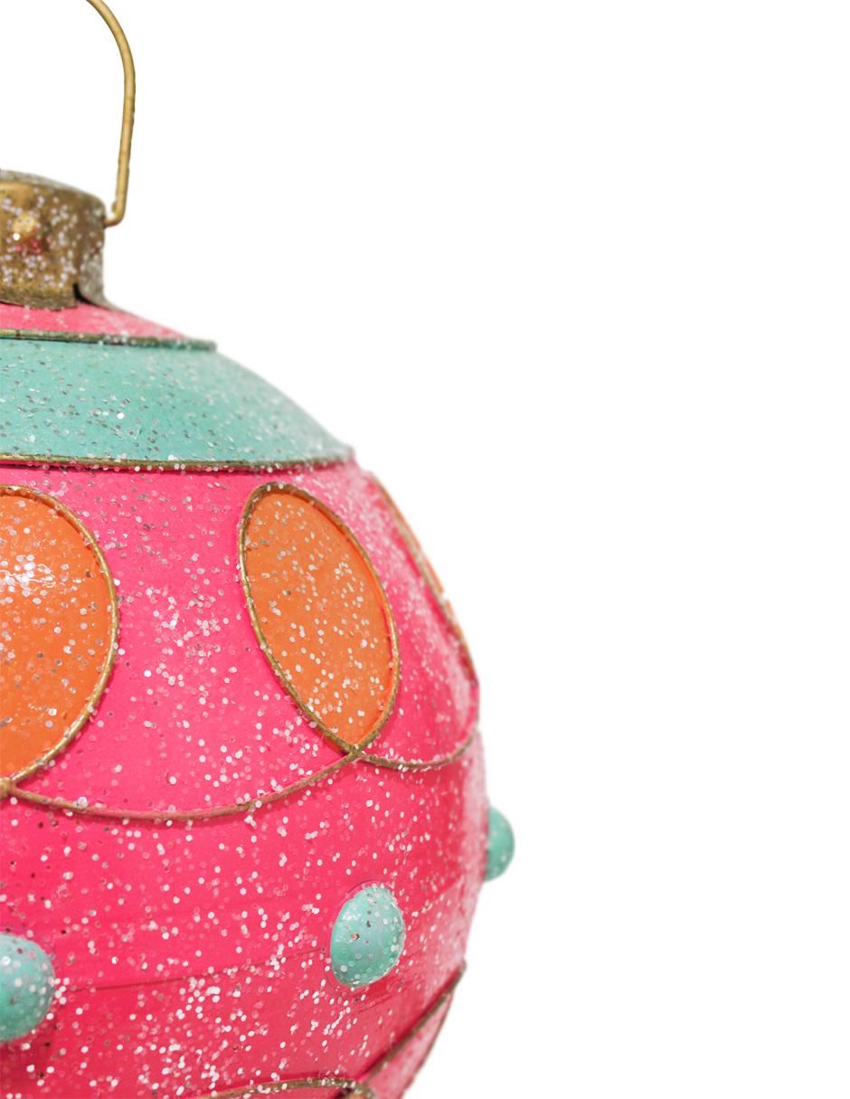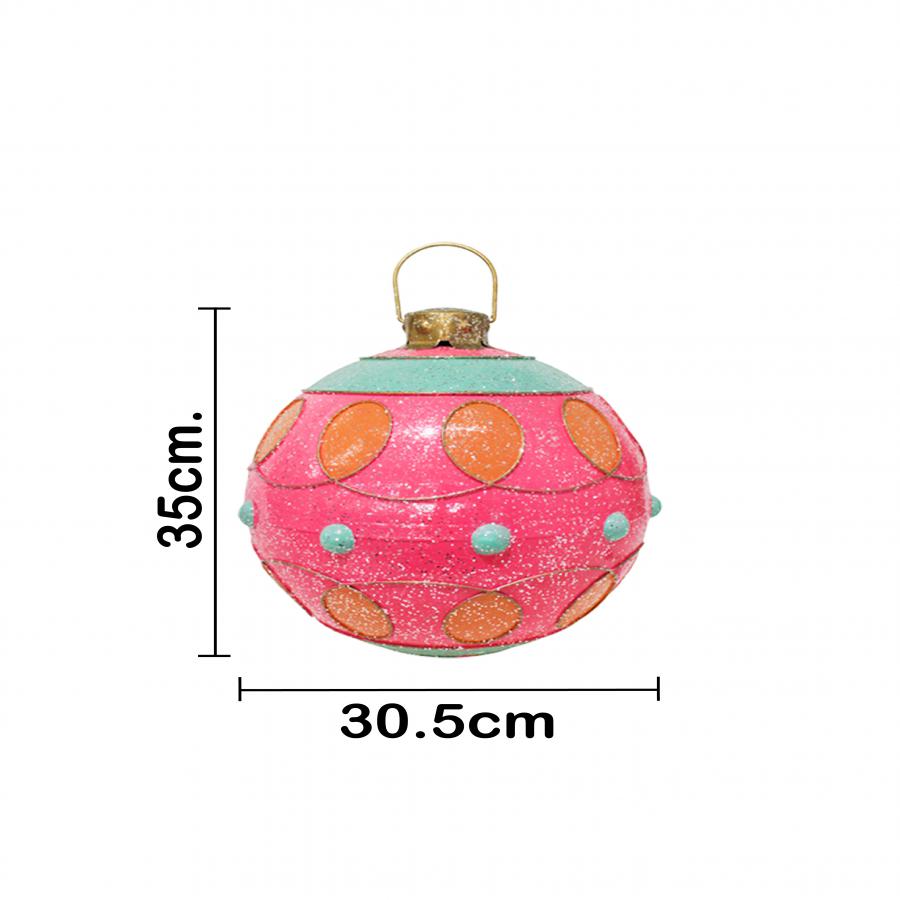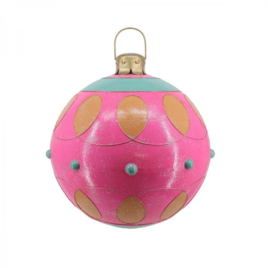 Esfera de decoración en un delicado color rosa, adornada con patrones en amarillo y aqua. Esta pieza es perfecta para quienes buscan una decoración moderna y original que se aleje de lo tradicional. Su vibrante combinación de colores evoca una sensación de alegría y frescura, ideal para crear un ambiente lúdico y festivo. Material: metal. Medidas: 30.5×30.5x35cm.