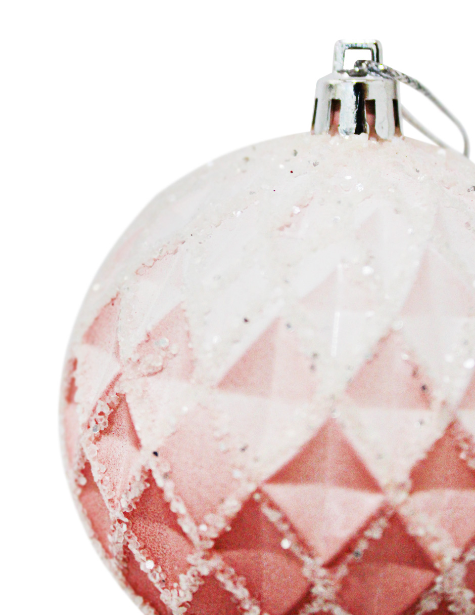 Esfera de plástico en color rosa con un diseño de rombos diamantados en blanco. Es perfecta para añadir un toque de brillo y originalidad a tu decoración navideña. Mide 8cm.