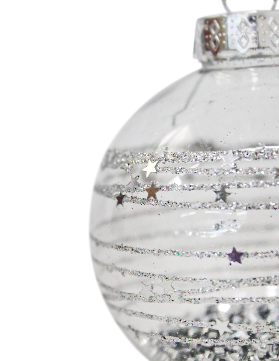Esfera transparente con estrellas plateadas. Ideal para un estilo sutil, moderno y que evoca un ambiente mágico.