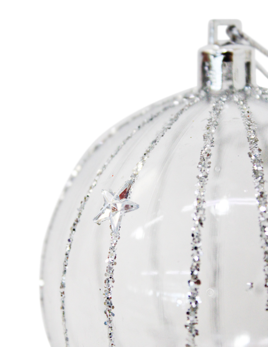 Esfera de plástico transparente con rayas plateadas diamantadas. Esta pieza añade un toque de brillo y elegancia a tu árbol, creando un efecto visual sofisticado. Mide 8cm.