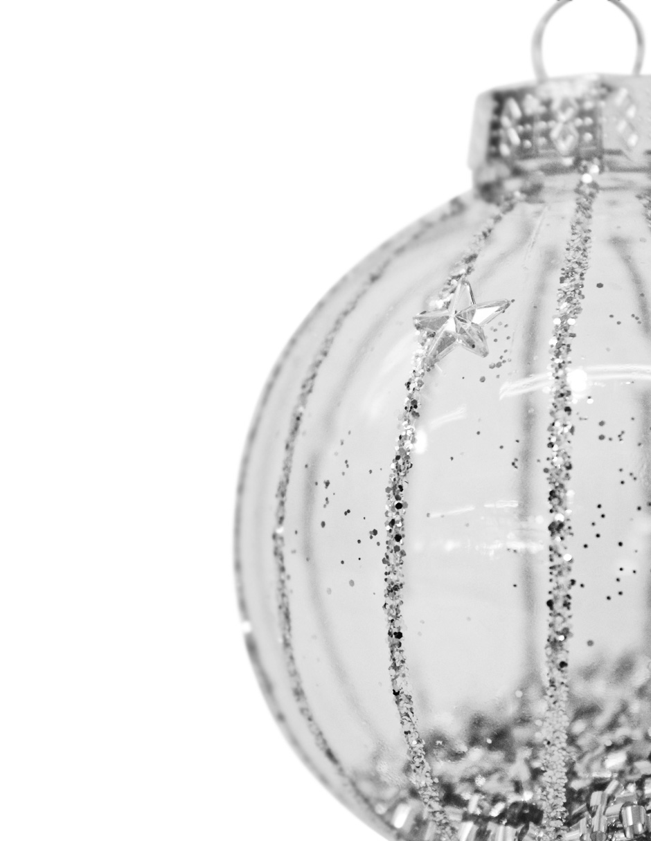 Esfera transparente rellena de canutillo plateado. Su diseño aporta brillo y un toque moderno, minimalista y elegante.