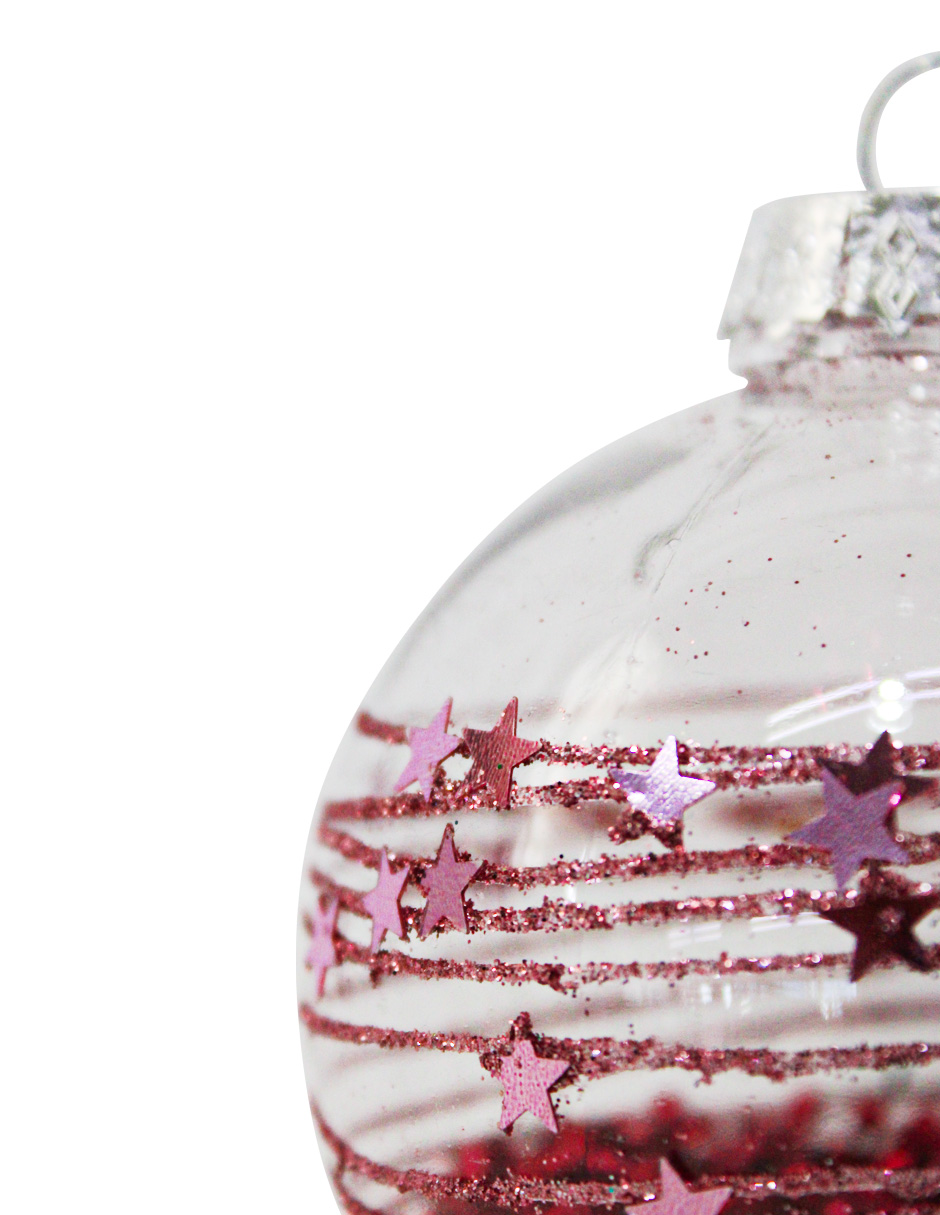 Esfera transparente rellena de canutillo rosa. Su diseño aporta brillo y un toque dulce, moderno y juvenil.