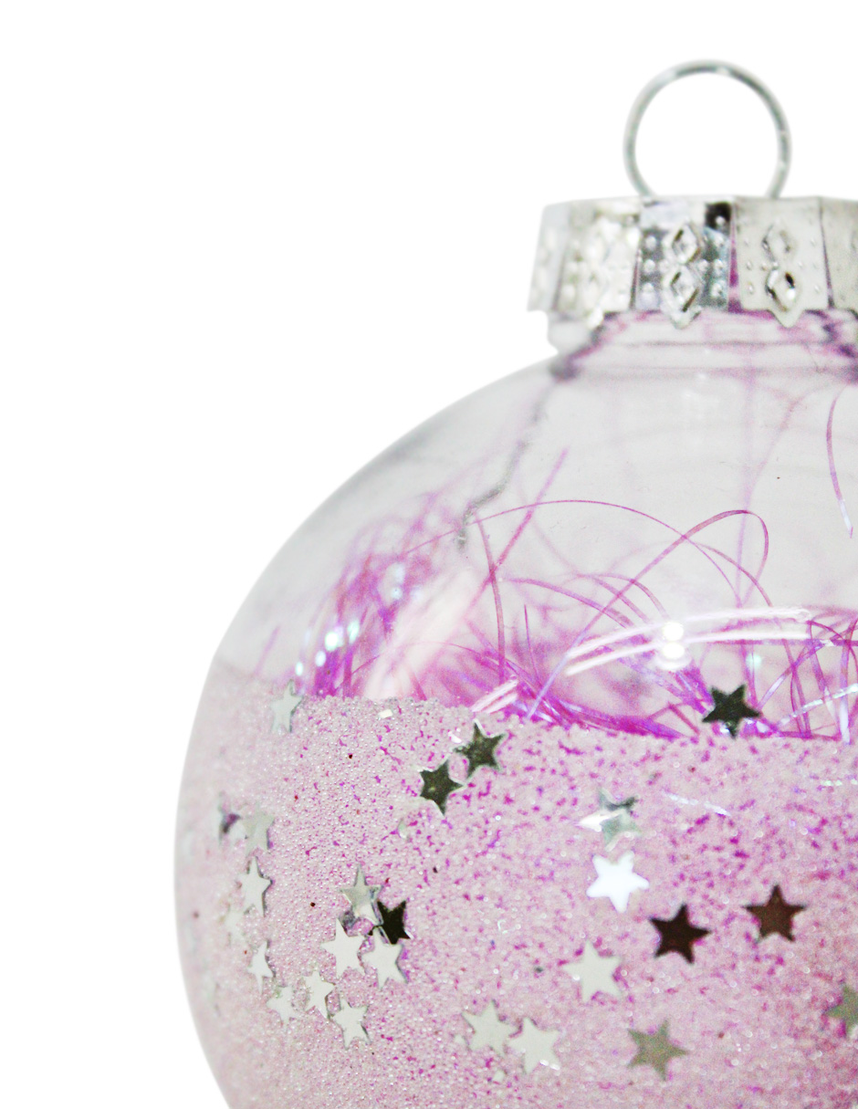 Esfera transparente rellena de hilo en color lila. Su diseño aporta una textura sutil, moderna y delicada.