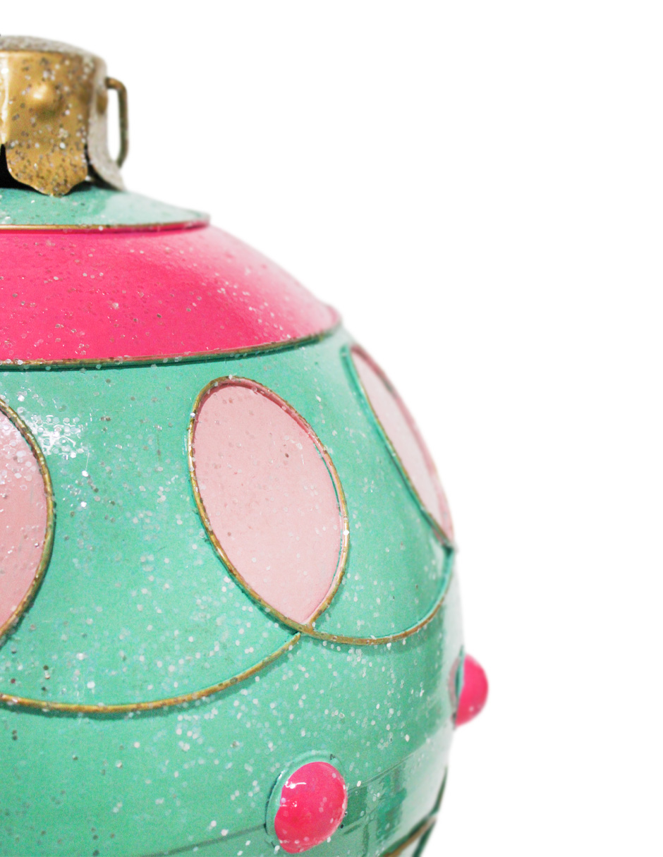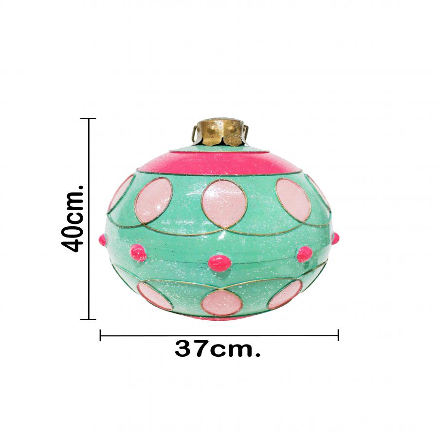 Esfera de decoración en un delicado color verde agua, adornada con patrones en rosa. Esta pieza es perfecta para quienes buscan una decoración moderna y original que se aleje de lo tradicional. Su vibrante combinación de colores evoca una sensación de alegría y frescura, ideal para crear un ambiente lúdico y festivo. Material: metal. Medidas: 35x35x38cm.