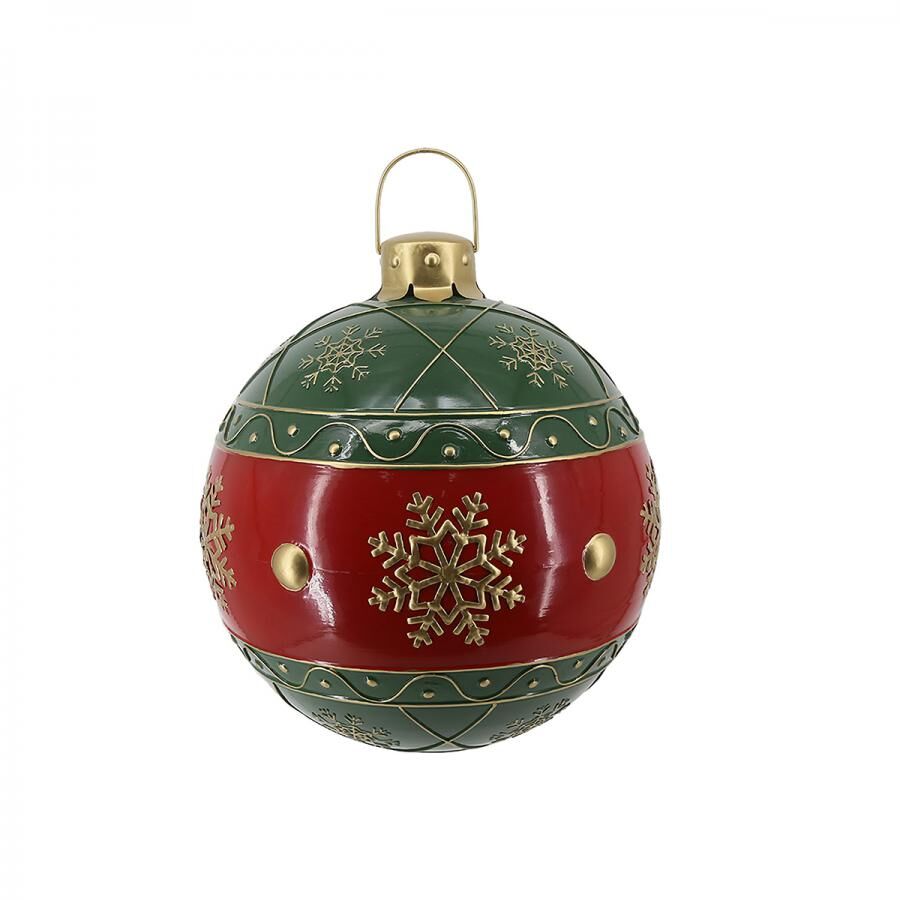 Esfera de plástico en la combinación clásica de verde y rojo con elegantes copos de nieve dorados. Un diseño tradicional con un toque de lujo.