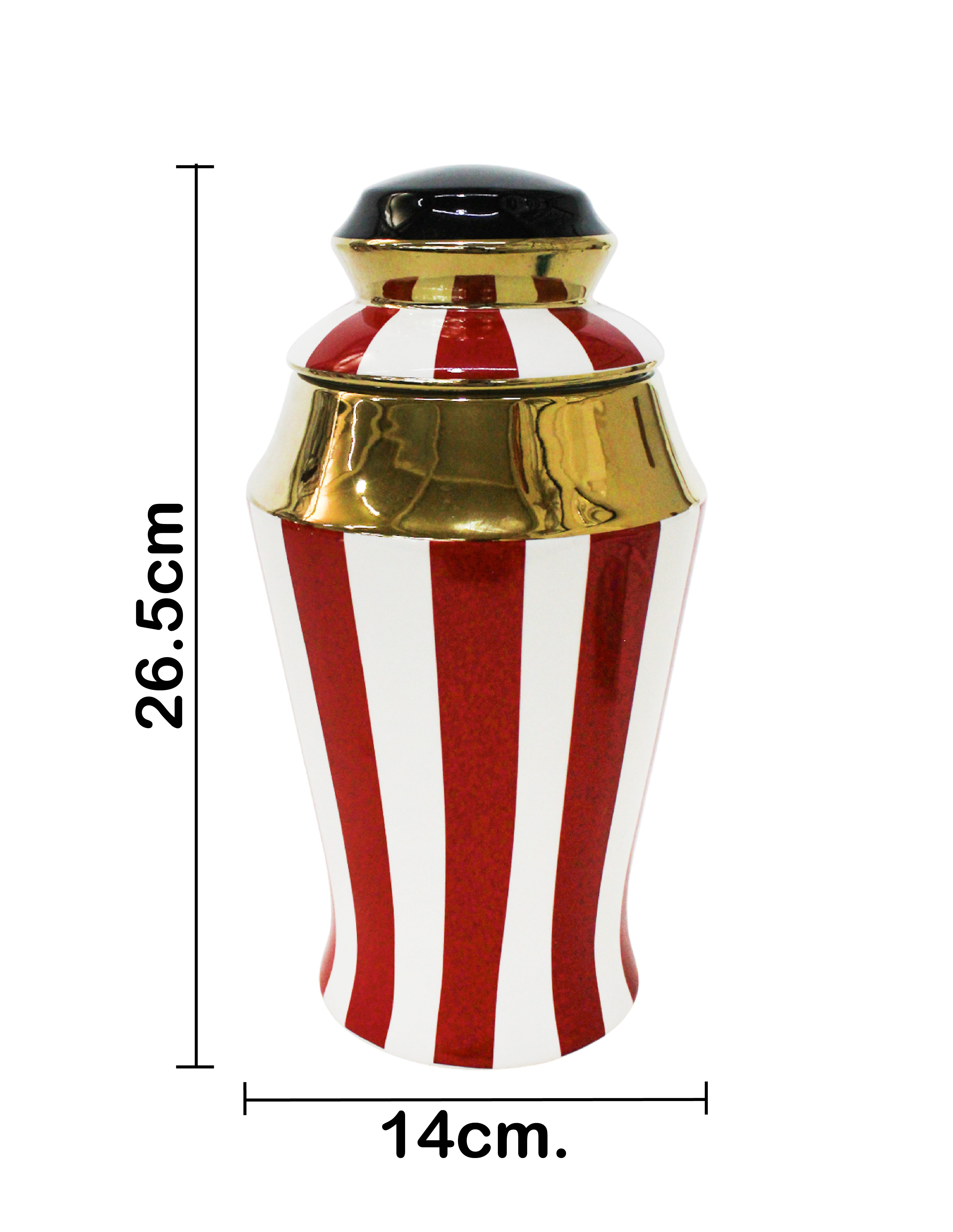 Especiero de cuerpo completo de porcelana con rayas rojas y blancas. La tapa negra crea un look clásico y sofisticado. El material es porcelana. Medidas: 14 x 14 x 27 cm.