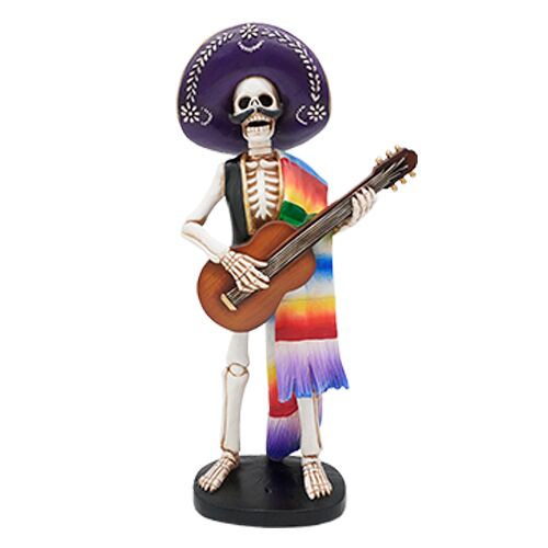 Un toque de folclore y arte en una pieza. Esta calavera con sarape, sombrero y guitarra es una figura decorativa que evoca la celebración del Día de Muertos. Con sus medidas de 19×10.6×38.6cm, es ideal para un hogar que busca un toque de cultura y color.