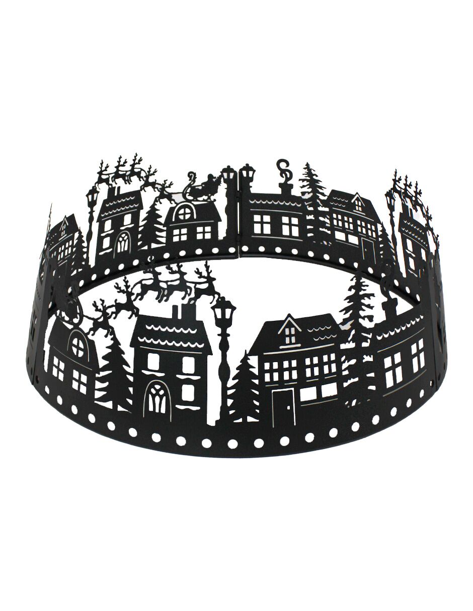 Siente la calidez de la Navidad con esta encantadora falda de metal negro. Su diseño de aldea navideña te hará sentir la tranquilidad y la alegría. Es ideal para rodear la base del árbol, creando un paisaje festivo y acogedor. Medidas: 66x66x25.4 cm.