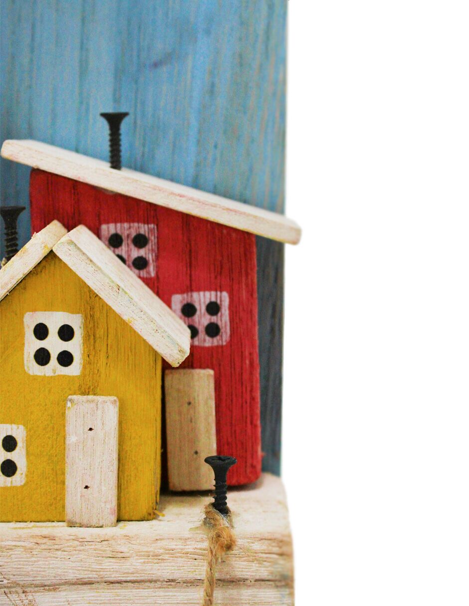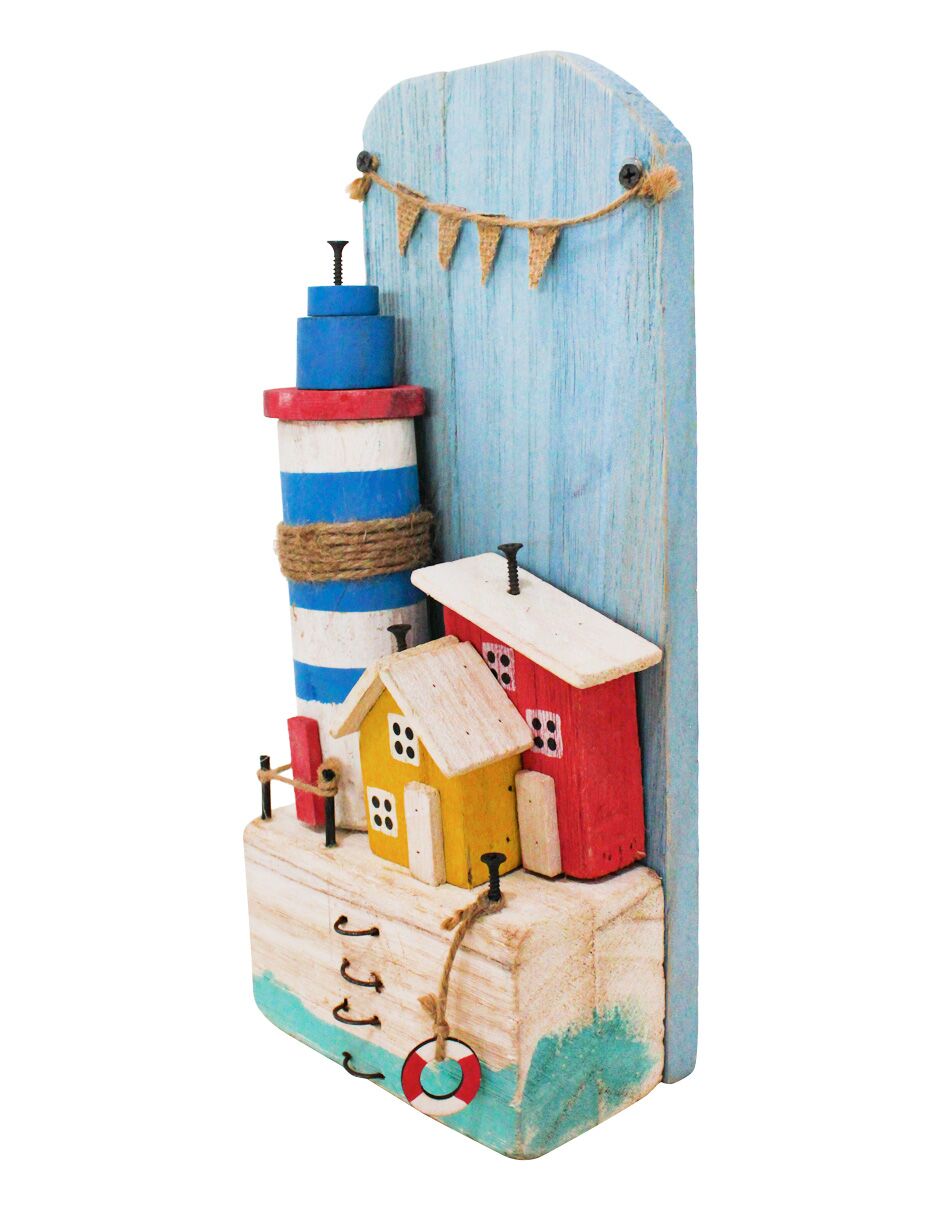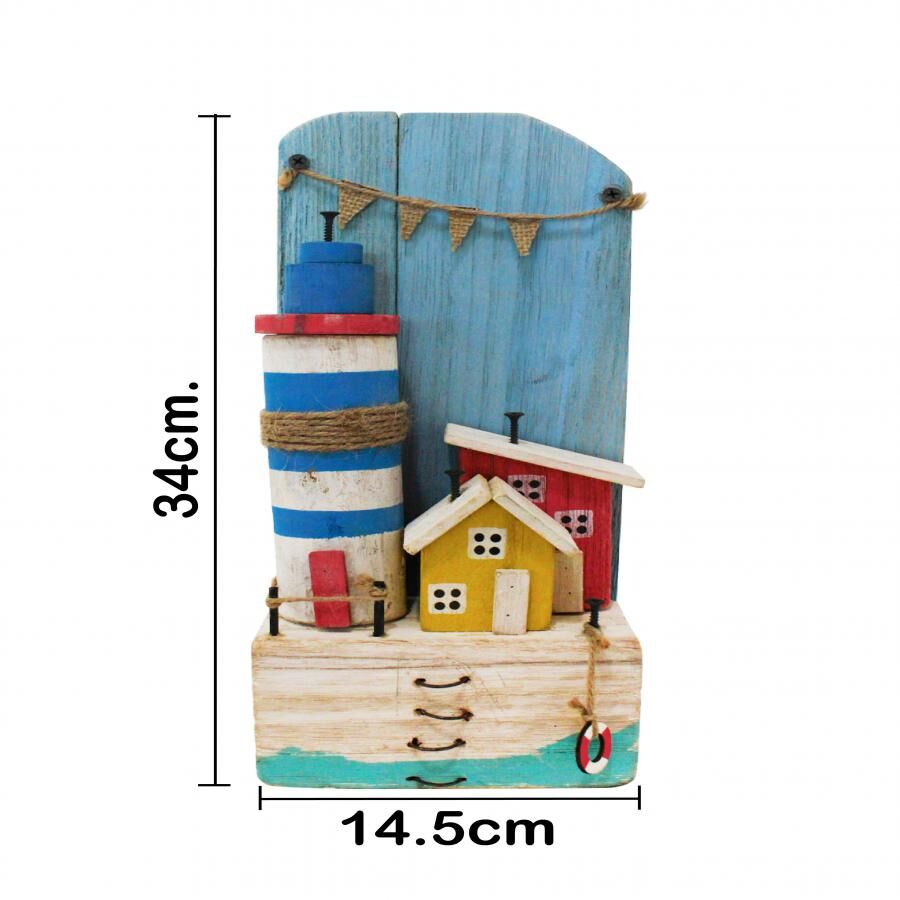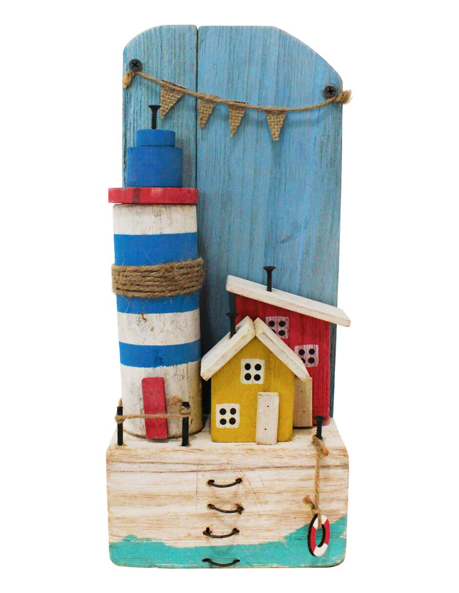 Decoración con un original diseño de faro y una casa de playa en colores amarillo y rojo con escaleras de anillo. Esta pieza es ideal para quienes buscan una decoración marinera y rústica. Su diseño único evoca una sensación de frescura y tranquilidad, perfecta para crear un ambiente único y lleno de encanto. Material: madera, metal.