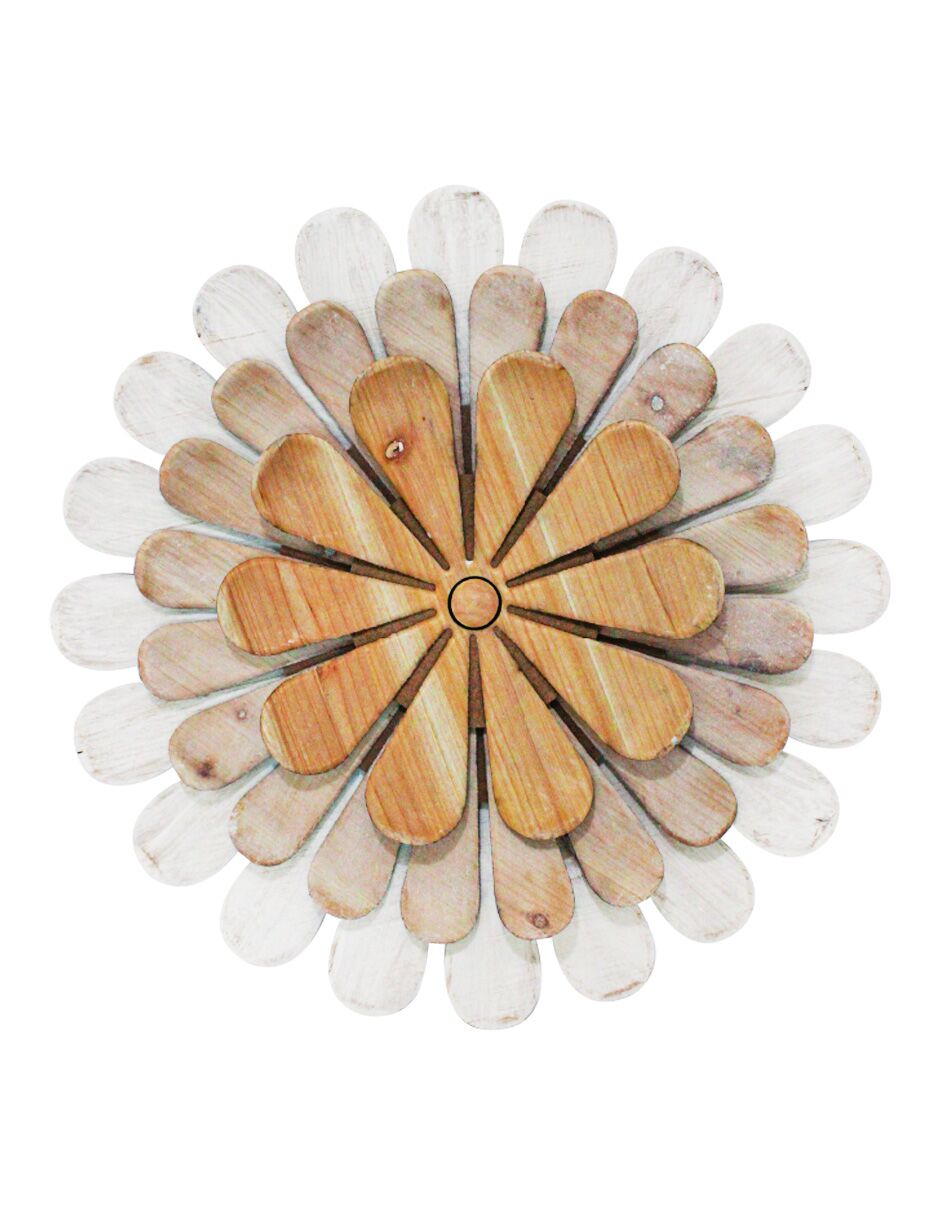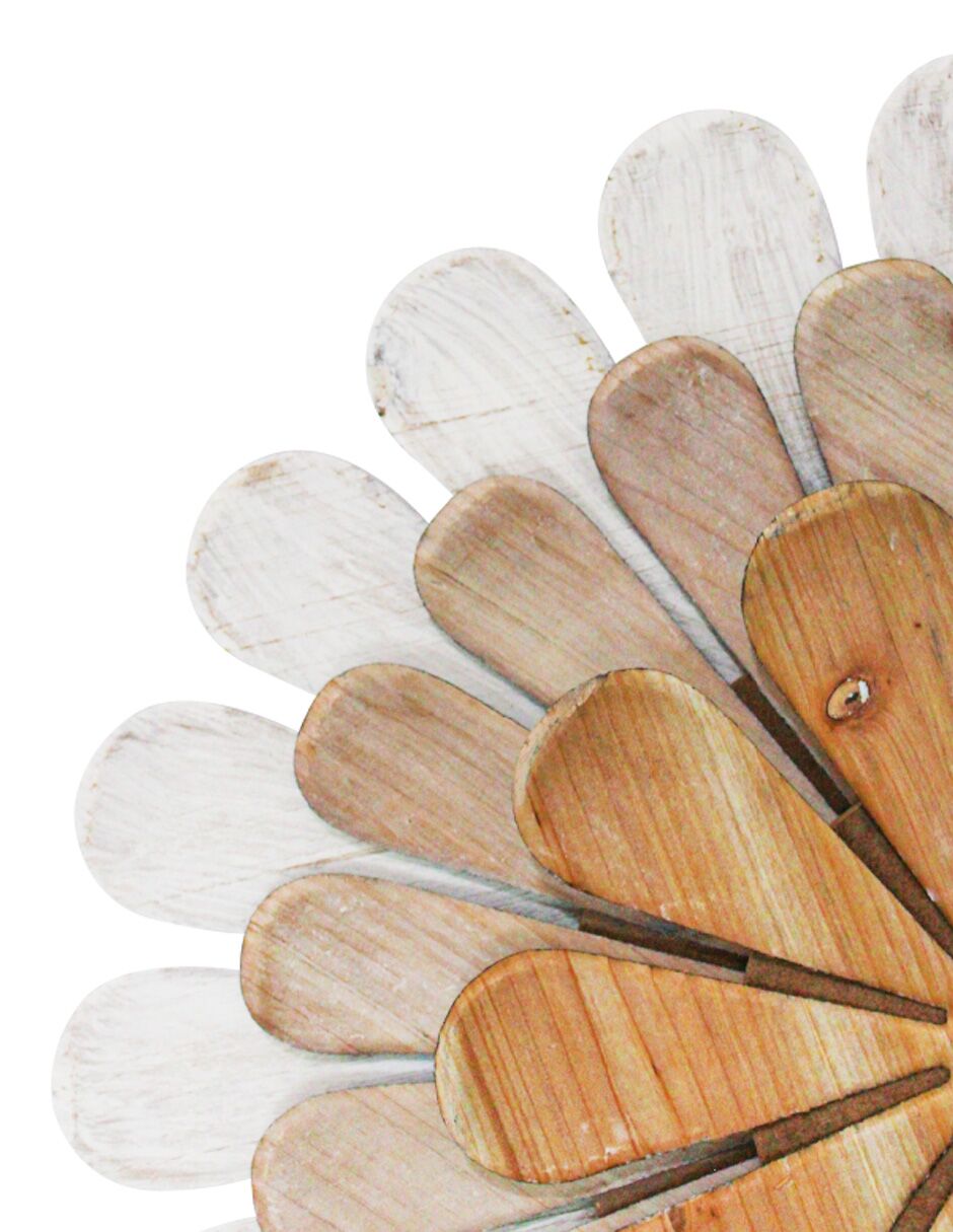 Una hermosa flor de madera con detalles de metal para pared. Esta pieza es perfecta para quienes buscan un elemento decorativo que evoque la belleza de la naturaleza y un estilo rústico moderno. Material: madera y metal. Medidas: 51 x 5 x 51cm.