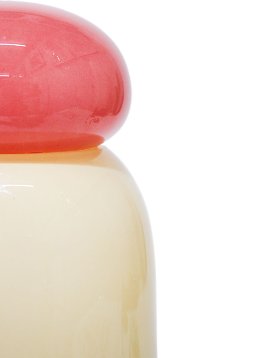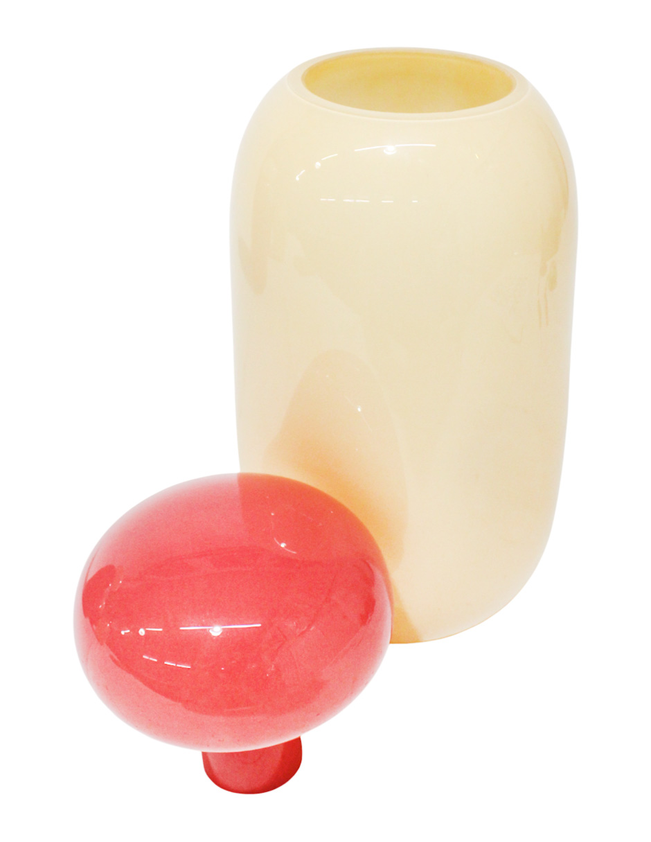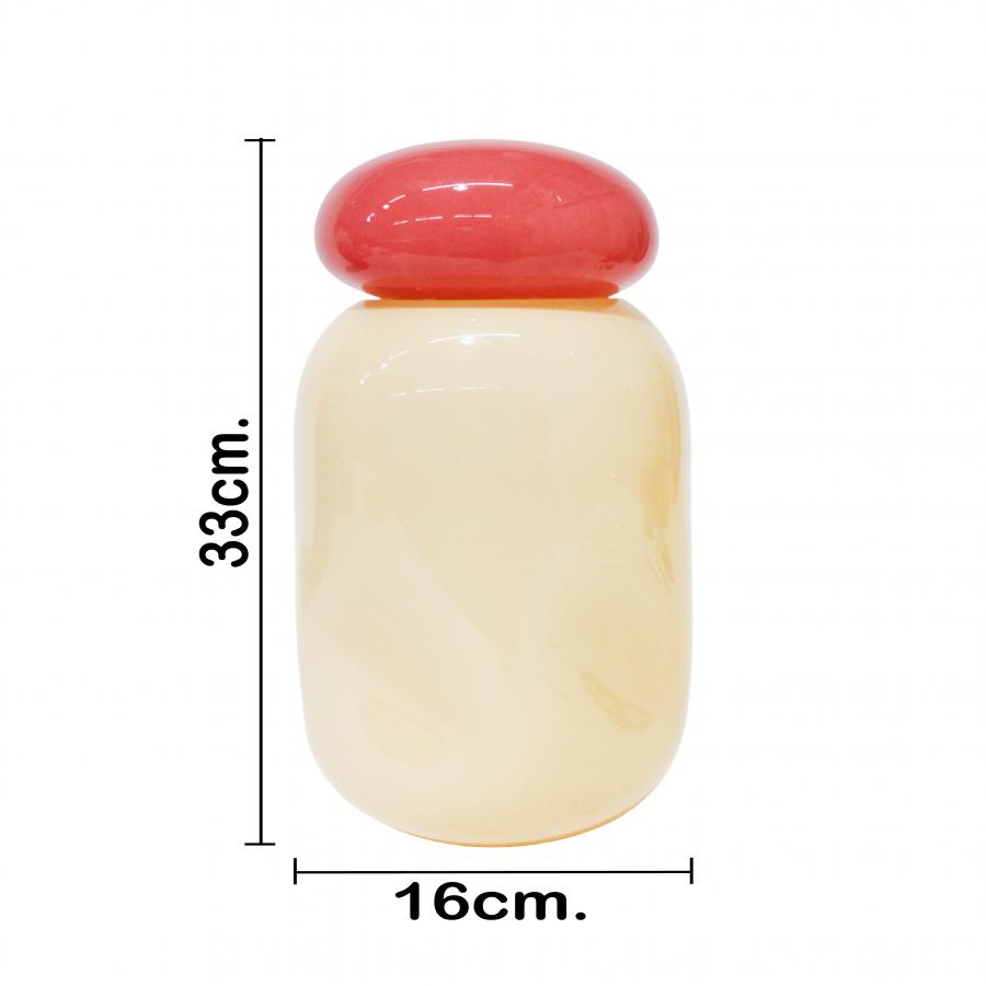 Florero beige con una tapa en color mamey. Esta pieza es ideal para quienes buscan una decoración moderna, funcional y llena de estilo. Su diseño minimalista y combinación de colores evoca una sensación de frescura y alegría, perfecta para crear un ambiente único que ilumine tus espacios. Material: cerámica.