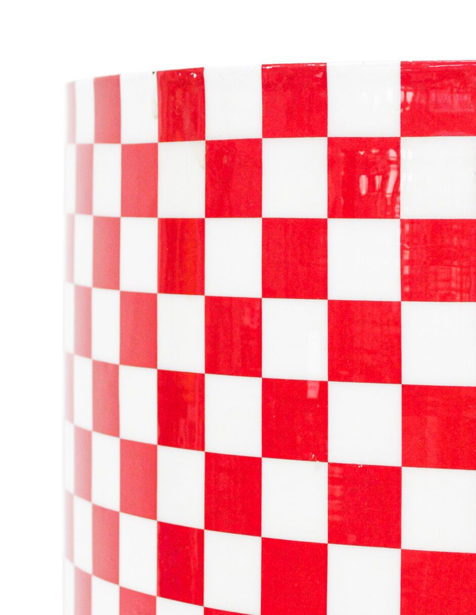 Florero de metal diseño cuadros rojos con blanco de 32x32x54cm