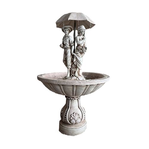 Esta fuente decorativa, elaborada en resina de alta calidad, presenta una encantadora escena de una pareja bajo una sombrilla. Con unas medidas de 90x90x160cm, su acabado en imitación piedra le otorga un aspecto clásico y atemporal. El suave murmullo del agua crea una atmósfera relajante, ideal para jardines, patios o grandes interiores.