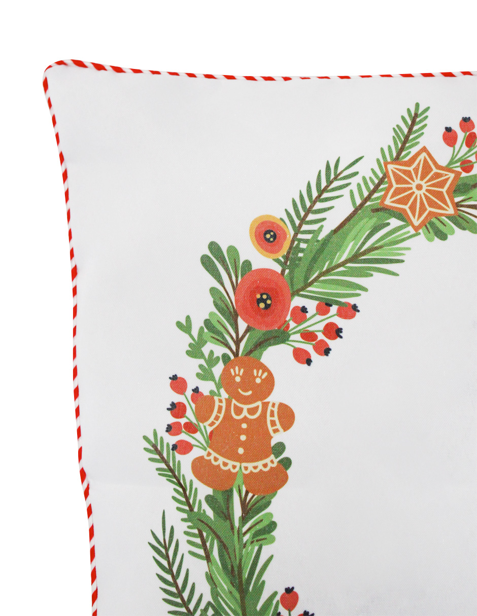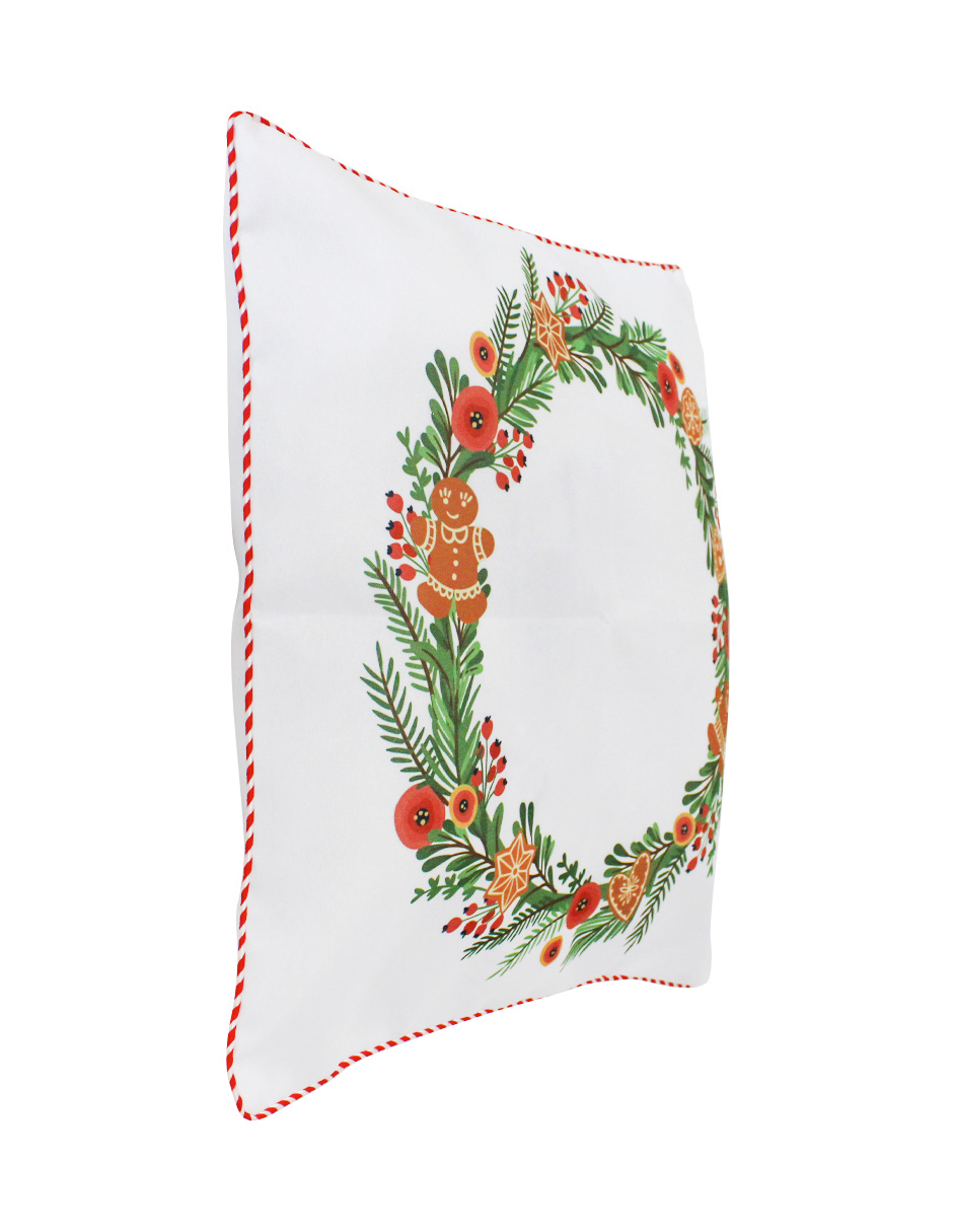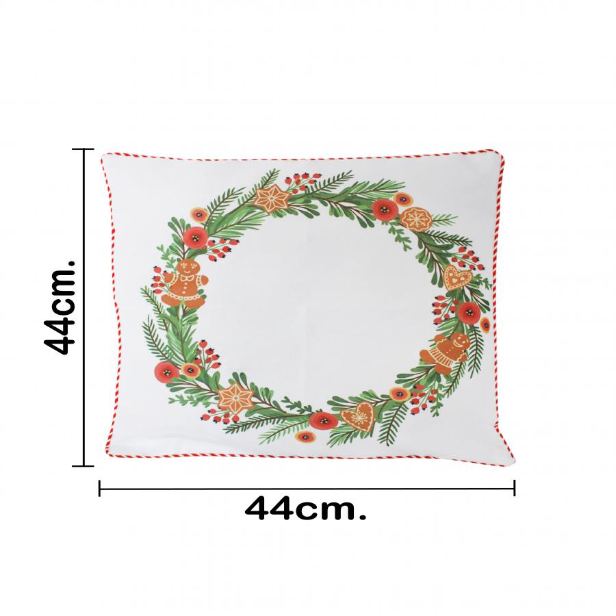 Funda para cojín con un diseño de corona de Navidad y muérdagos. Este accesorio es perfecto para dar la bienvenida a la temporada festiva, llenando tu hogar de un ambiente acogedor, alegre y lleno de la magia que solo las fiestas pueden crear. Material: poliéster. Medidas: 45x45cm.