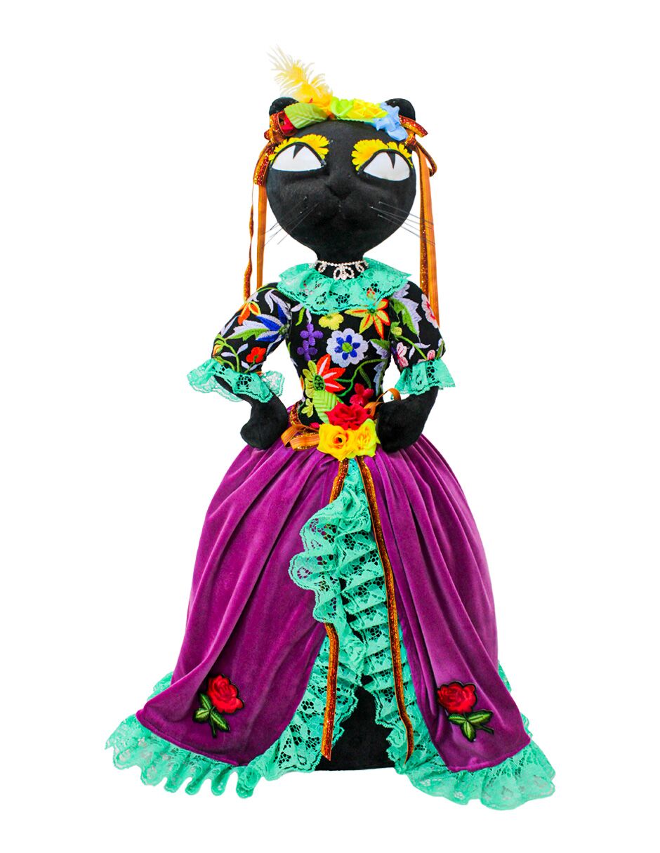 Un toque de originalidad y encanto folclórico para tu hogar. Esta figura decorativa, con un tamaño de 35x27x71cm, es la pieza perfecta para añadir un aire de fantasía a tu decoración de temporada. Con un diseño detallado que muestra un gato negro con un elegante vestido de flores y una decoración de estilo Catrina, su figura crea un ambiente lleno de vida, ideal para cualquier rincón temático, y sorprenderá a tus invitados con su diseño único.