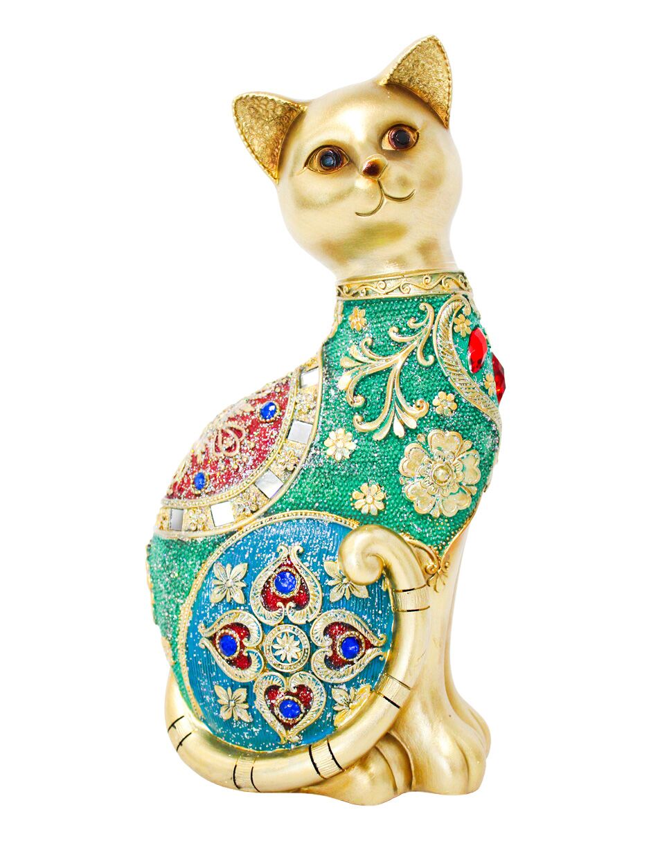 Gato de poliresina dorado con incrustaciones rojas y azules de 15x10x30cm