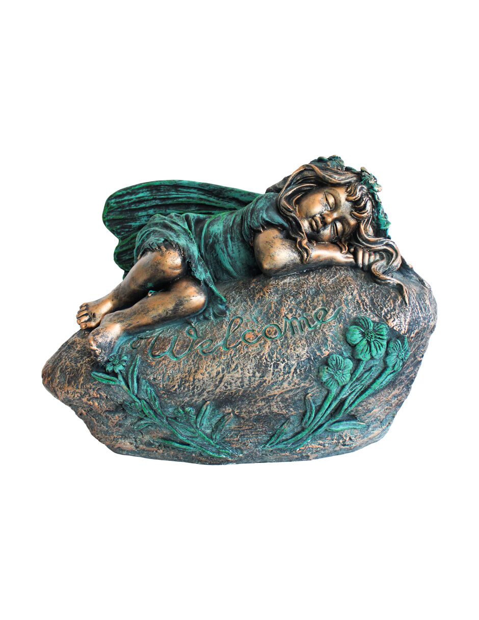 Esta serena escultura de hada recostada de 43cm, con un acabado en tonos bronce y verde, es perfecta para crear un rincón de paz y descanso. Ideal para colocar entre flores o cerca de una fuente en tu jardín.