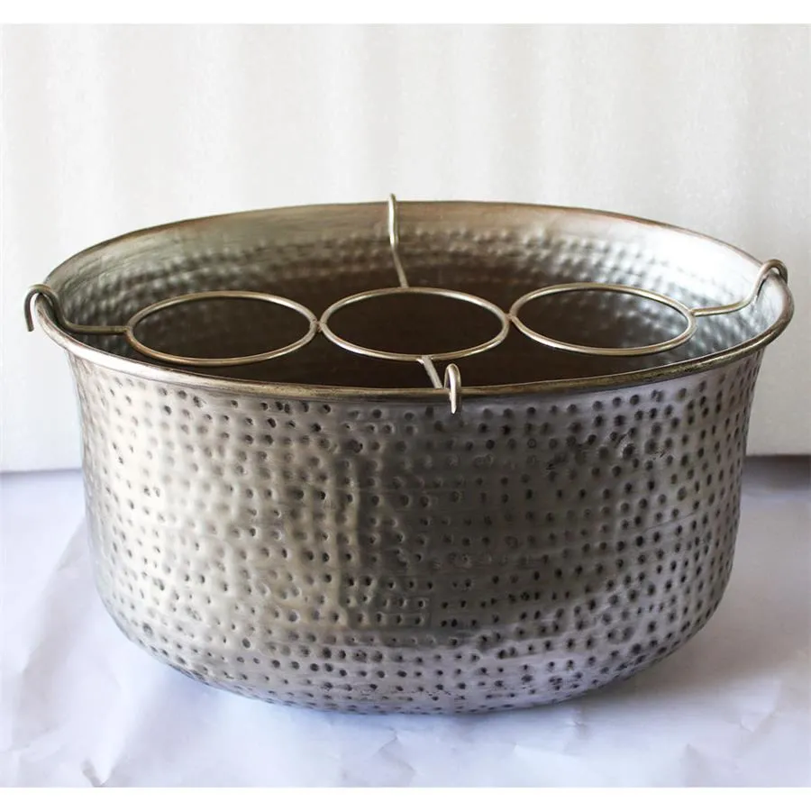 Hielera extra grande diseñada para el servicio en eventos o reuniones. Su amplio interior permite enfriar múltiples botellas simultáneamente. Fabricada en metal resistente con un acabado plateado brillante y pulido de alto impacto visual. El material es metal. Medidas: 47 x 36 x 23 cm.