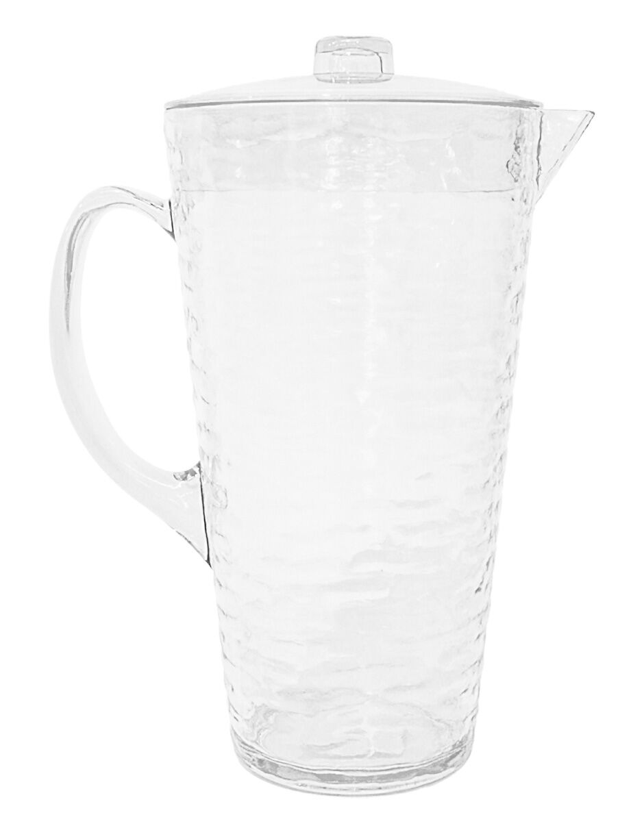 Jarra de servir en acrílico transparente con tapa. La tapa ayuda a proteger el contenido de insectos y polvo, ideal para exteriores. El material es acrílico. Medidas: 28 x 20 cm.