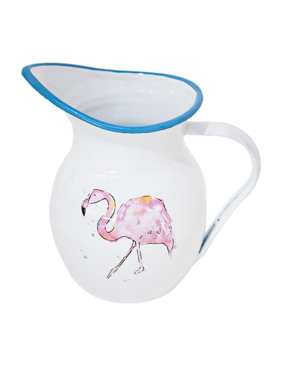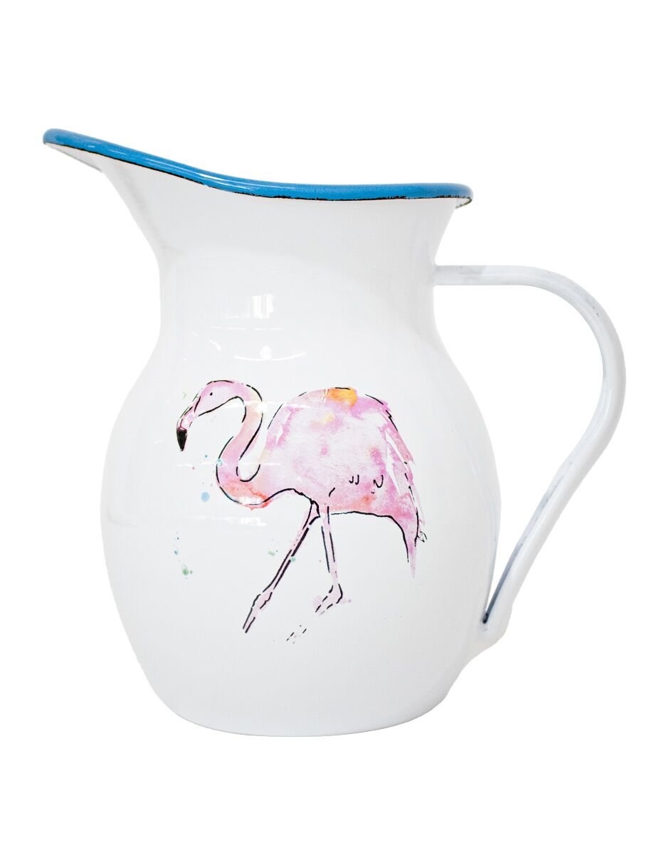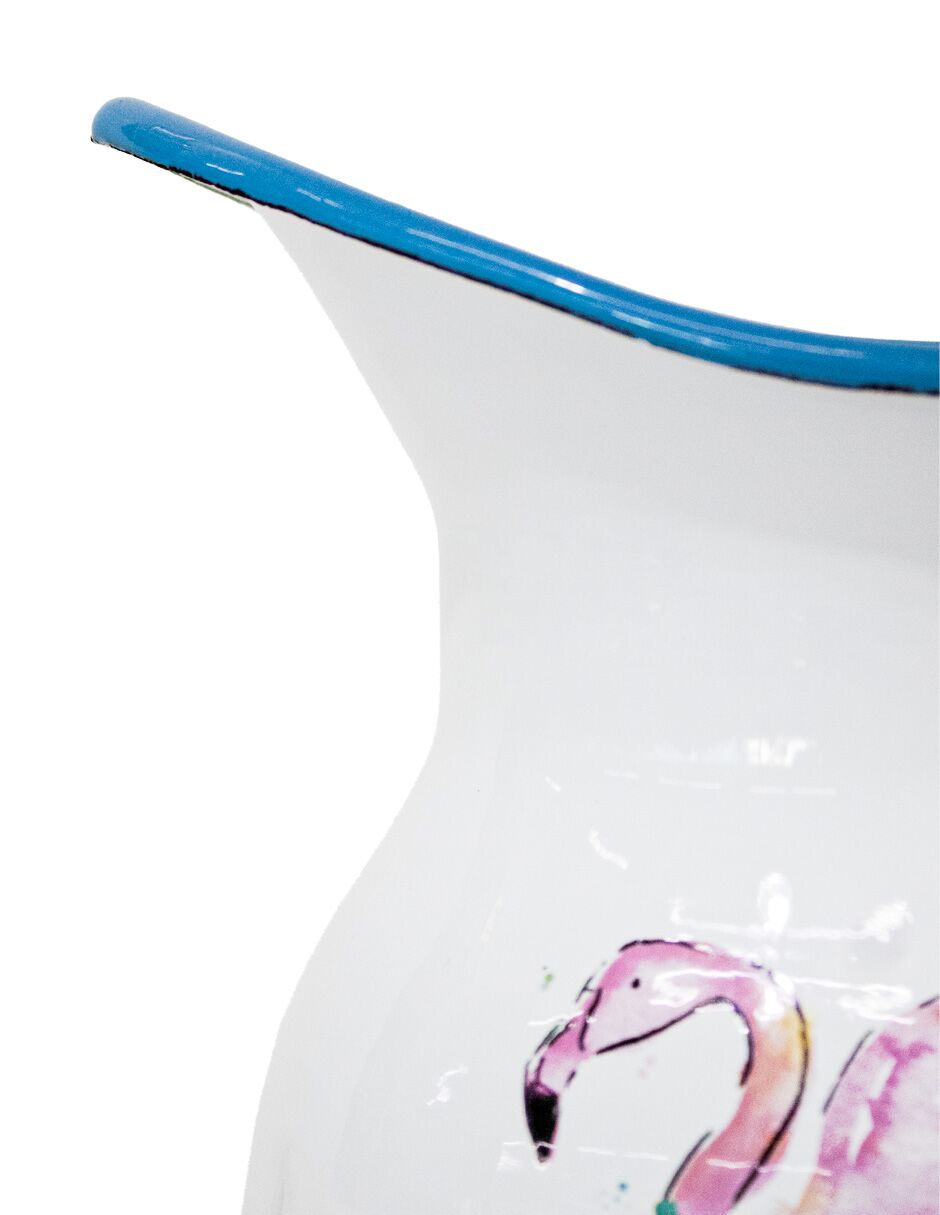 Sirve tus bebidas con un toque tropical. Esta jarra de peltre blanca con estampado de flamingo es perfecta para tu mesa. Su diseño te hará sentir la alegría y la diversión del verano. Mide 12x12x18cm.