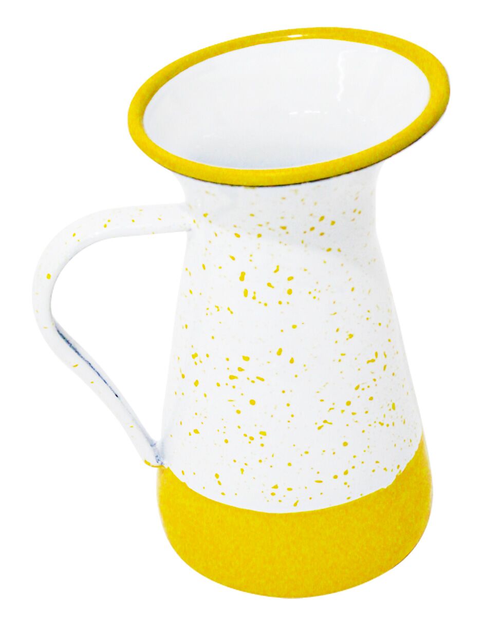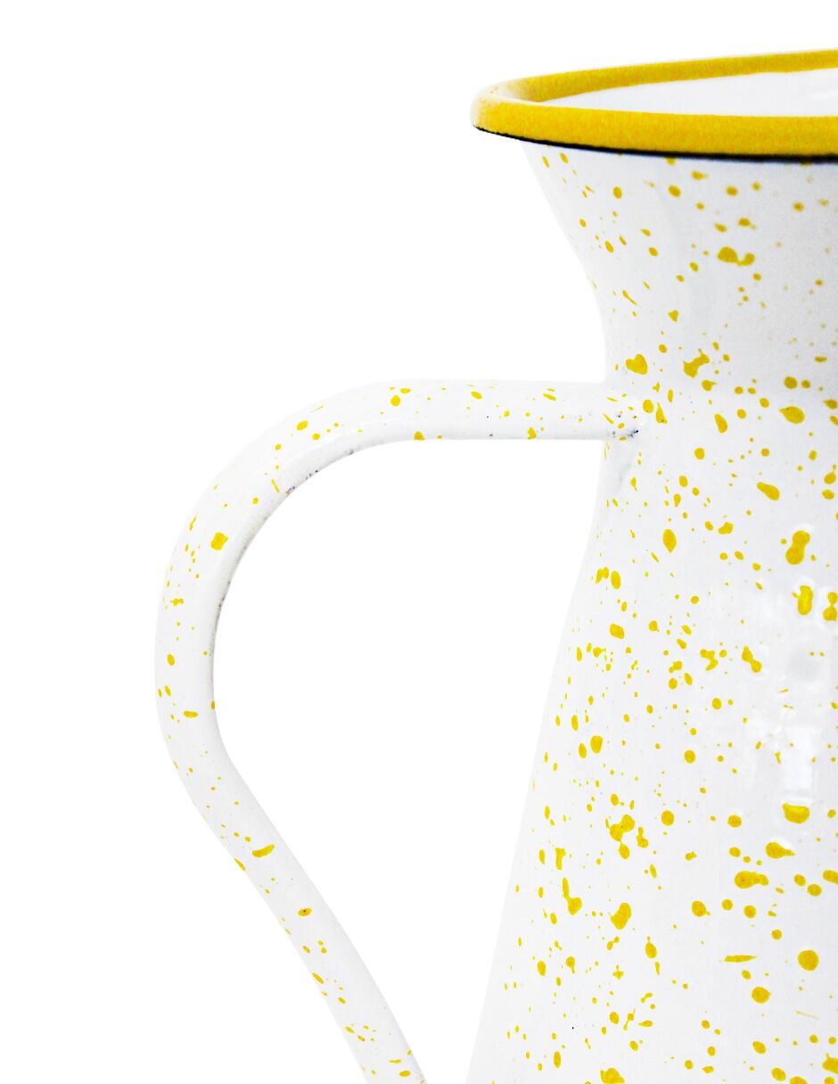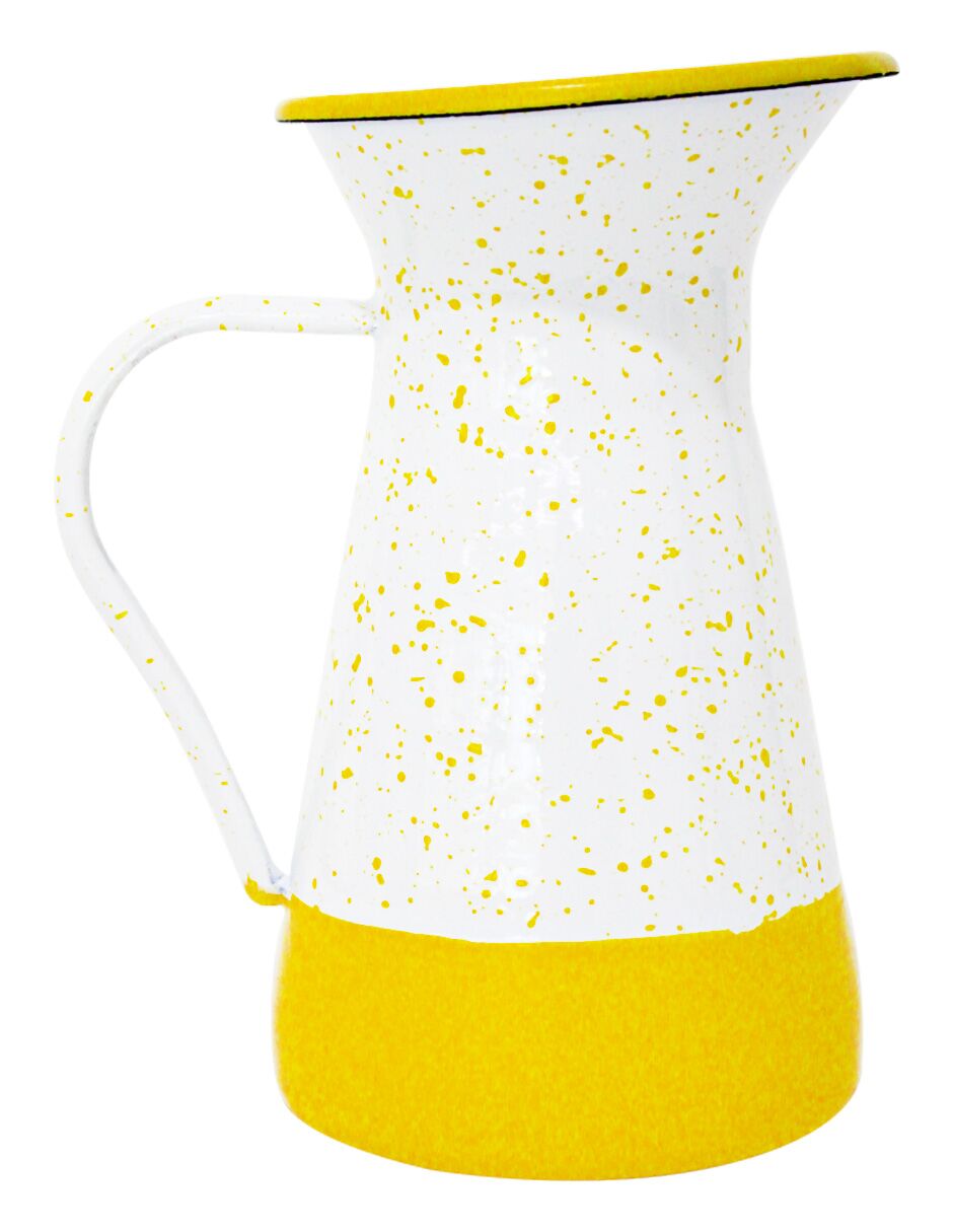 Sirve tus bebidas con un toque moderno y alegre. Esta jarra de peltre amarillo con blanco y puntos es perfecta para tu mesa. Su diseño te hará sentir la alegría y la diversión. Mide 12x12x20cm.