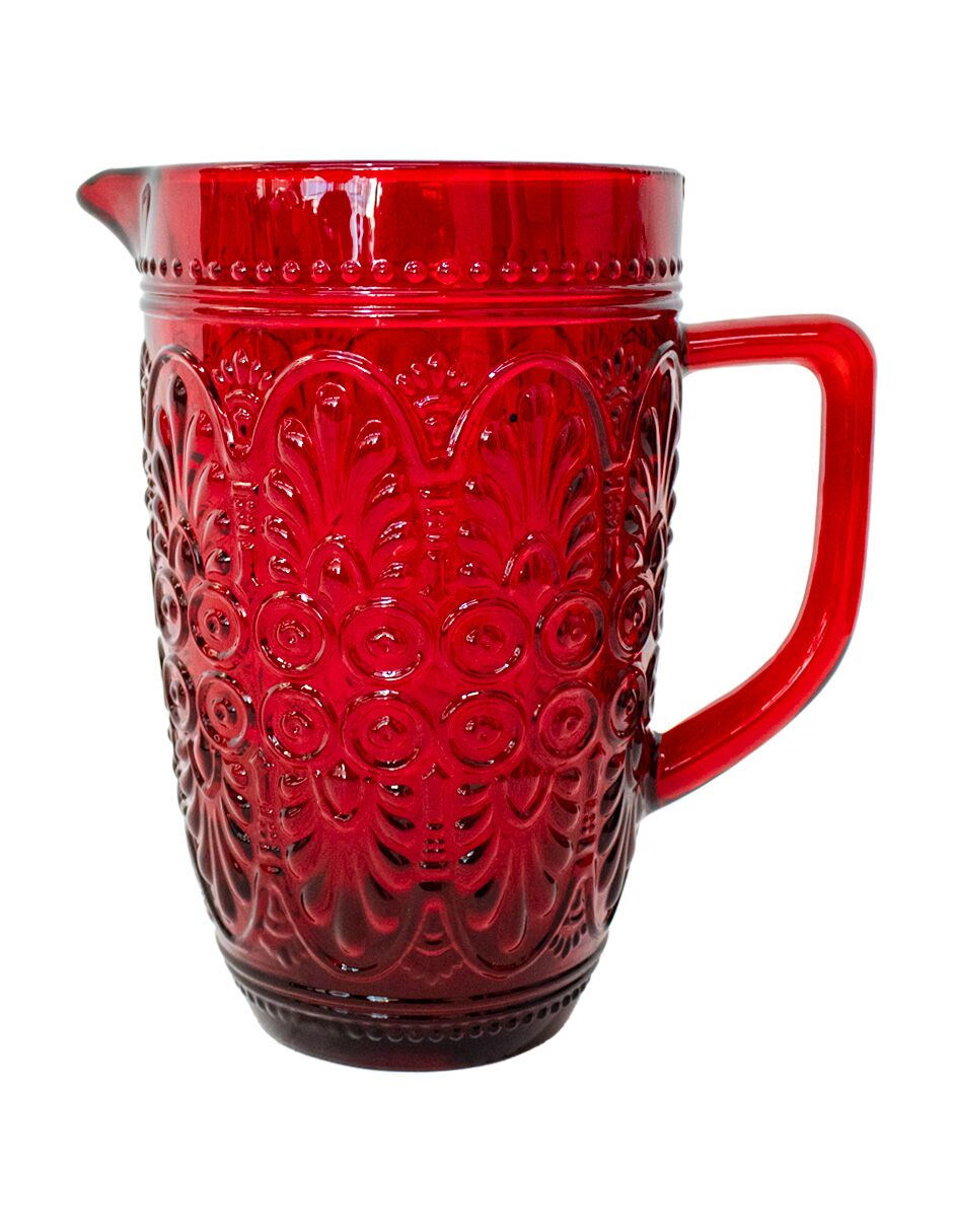 Una jarra de vidrio roja que añade un toque audaz y festivo a tu mesa. Es ideal para servir bebidas en ocasiones especiales o simplemente para dar un toque de color. Tiene una capacidad de 1330ml.