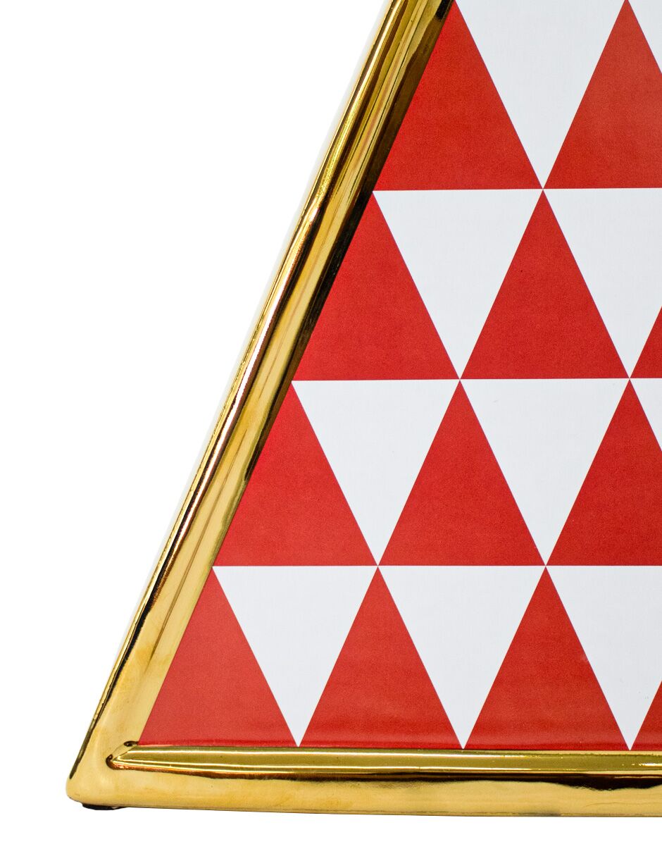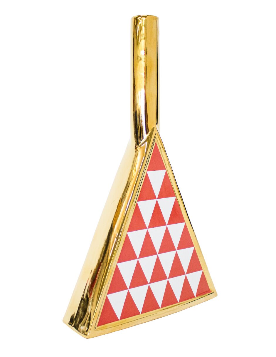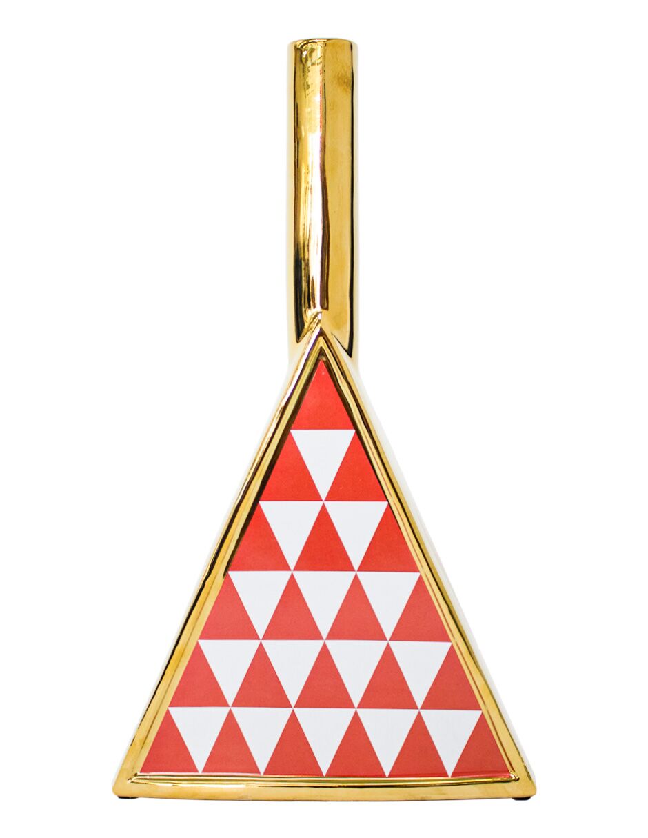 Dale un toque de elegancia y originalidad a tu espacio. Este jarrón de porcelana dorado triangular rojo con blanco es perfecto para embellecer tu hogar, añadiendo un acento sofisticado y moderno. Su diseño te hará sentir la creatividad y el orden. Mide 24x7x41.5cm.